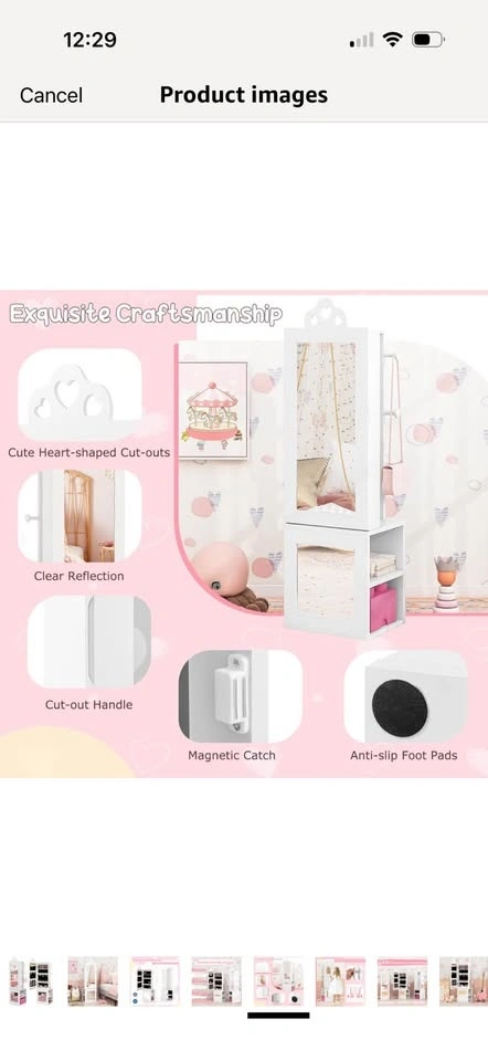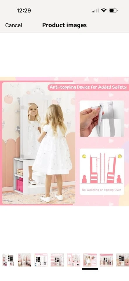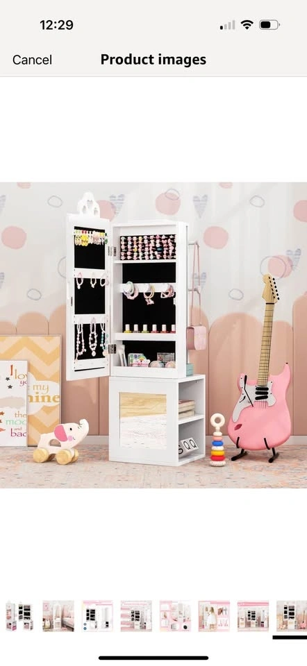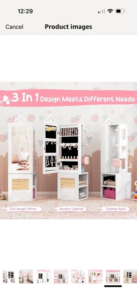 Brand new in opened box! See photos for slight imperfection around frame on mirror. Little bit of I’m assuming glue which could probably come off. Priced due to this. Multifunctional Kids Jewelry Armoire: Designed to meet all your little one's fashion needs, this kids jewelry cabinet blends a full-length mirror and clothes rack. Featuring cute heart-shaped cut-outs, it is not just a piece of furniture but also a charming decoration that suits any girl's bedroom. Multiple Storage Options: There are 10 earring slots, 9 necklace & bracelet hooks, 60 ring slots, 3 heart-shaped bracelet rods and 2 storage shelves inside the jewelry armoire. Plus, 3 rear storage shelves and 4 hooks offer additional space for kids to arrange clothes, bags, shoes, etc. Clear Full-length Mirror: This freestanding jewelry organizer comes with 2 real glass mirrors, which are crafted to reflect true colors and styles from head to toe, providing enhanced daily dressing up fun for your kids. Outstanding Stability: Built with your child's safety in mind, this floor jewelry armoire includes an anti-toppling device, ensuring a secure and worry-free setup in any room. Exquisite Craftsmanship: With the cut-out handle and built-in magnetic catch, the cabinet door can be opened conveniently and closed tightly. In addition, the anti-slip foot pads are included to protect the floor from scratches. Ideal Gift for Little Princess: Every little girl has a tiny dream of being a shiny princess. This standing jewelry armoire with full-length mirror allows your little one to dress up beautifully every day.