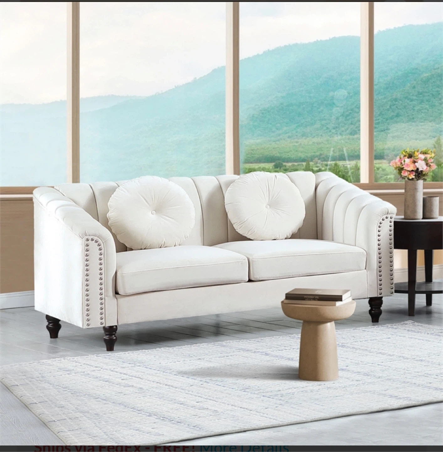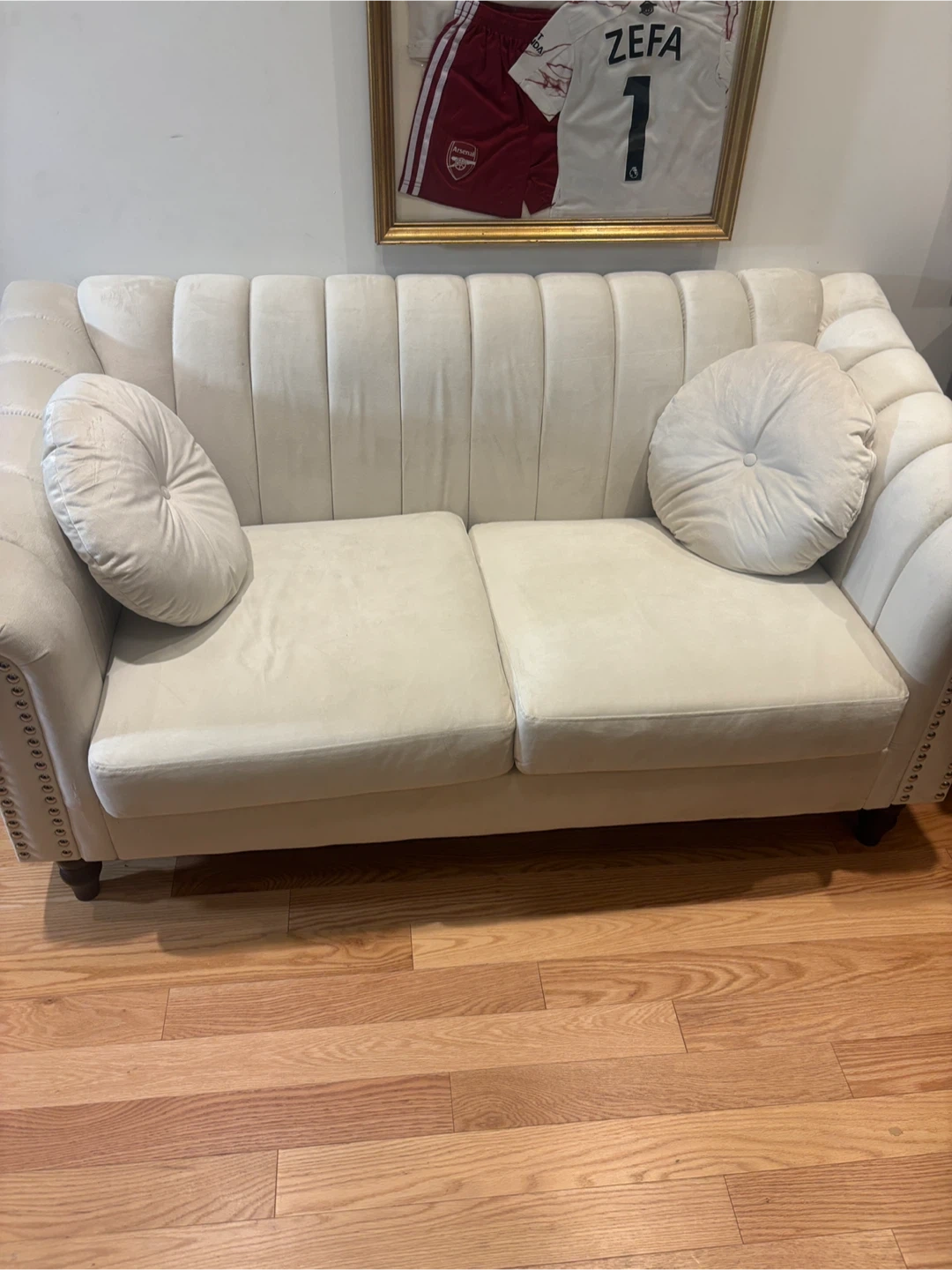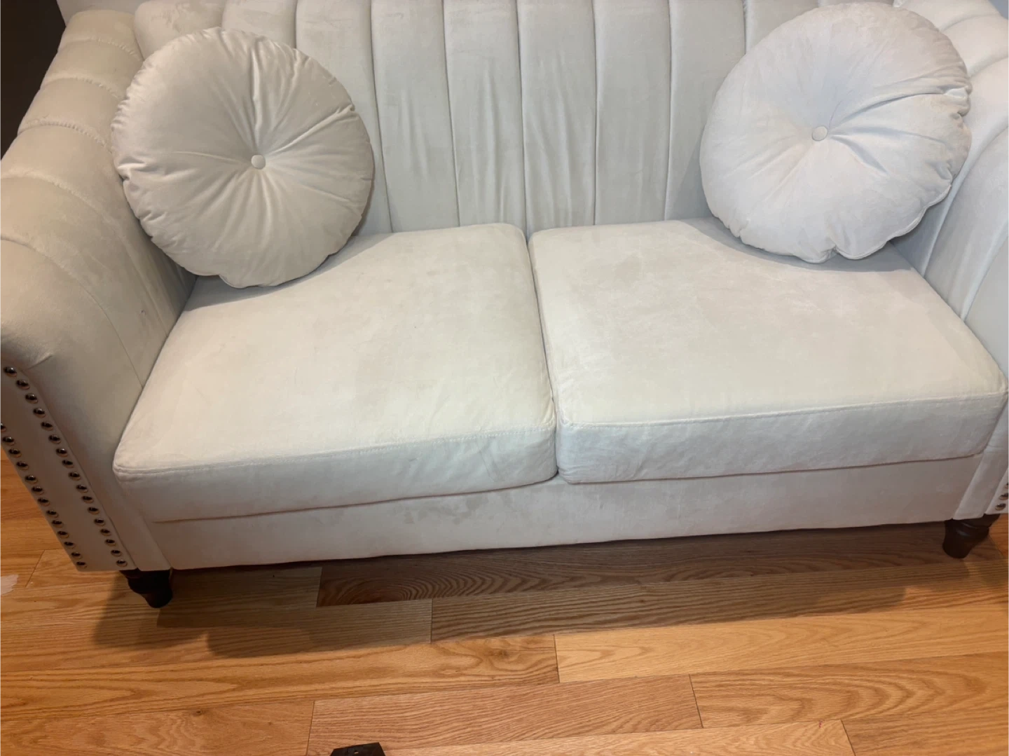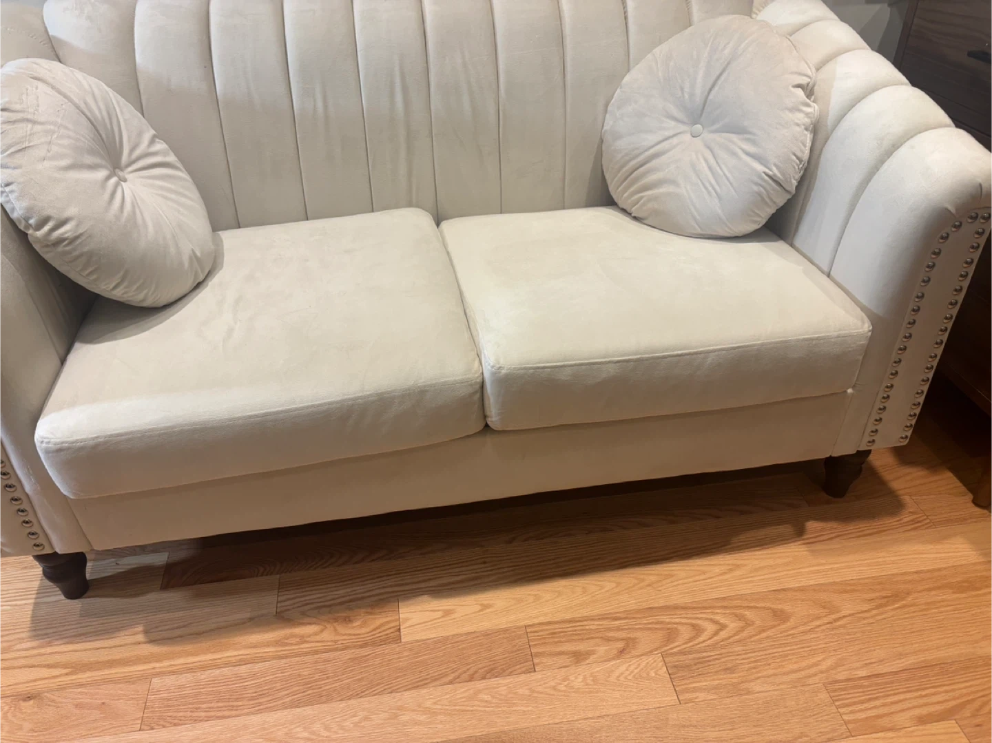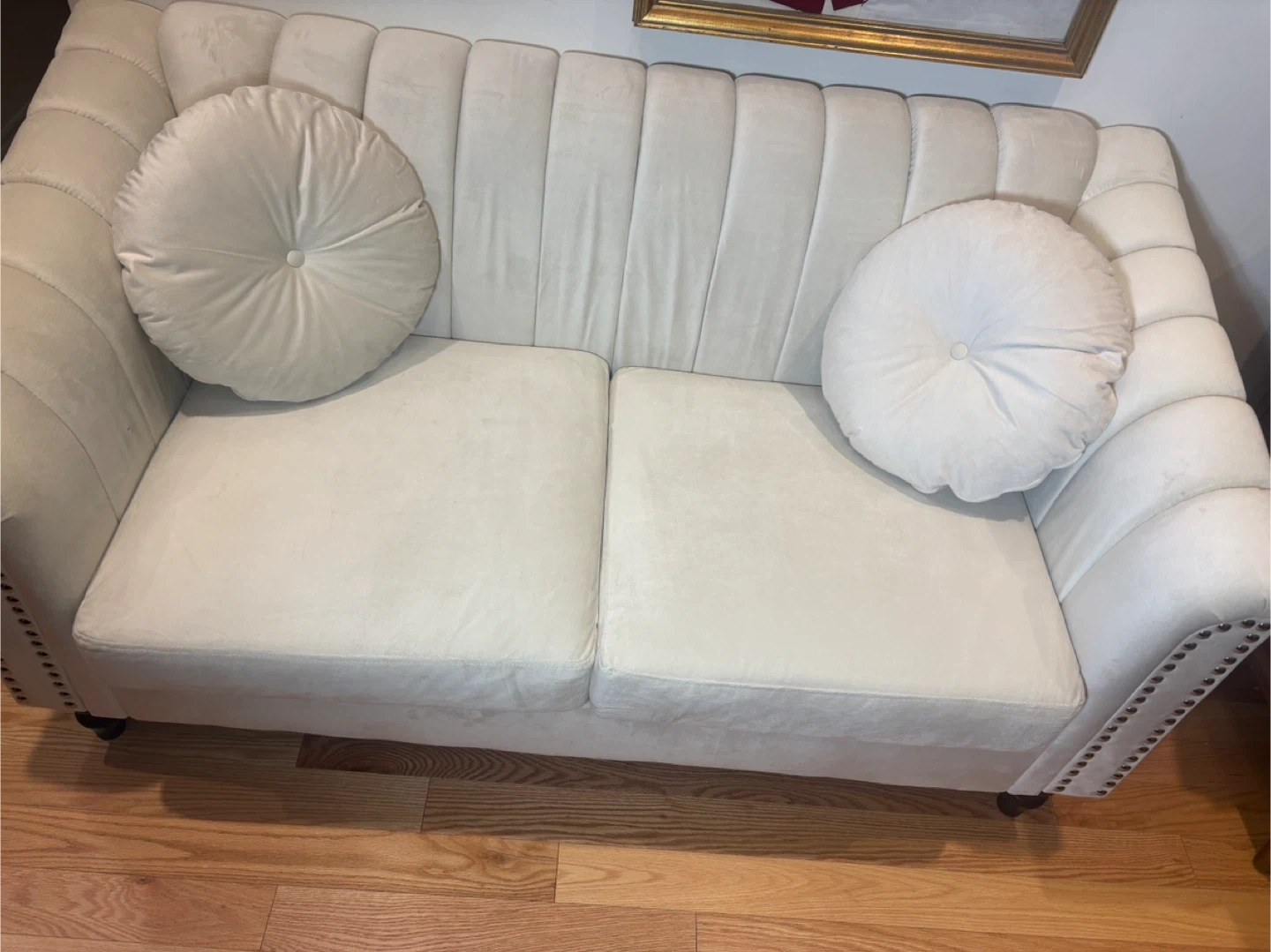 Cream velvet loveseat with studded detailing on the arms and a tufted back. It includes two round decorative pillows. Seat depth is 22 inches and total width is 60 inches. This loveseat's classic design complements various decor styles.