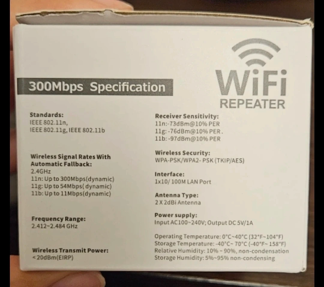 Selling a WiFi repeater range extender. It supports up to 300Mbps. It has standards IEEE 802.11n, IEEE 802.11g, IEEE 802.11b. It also supports wireless security WPA-PSK/WPA2-PSK (TKIP/AES). PU only at Coppersmith/Ironwood Plaza.