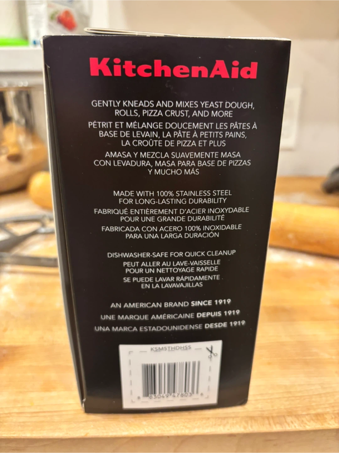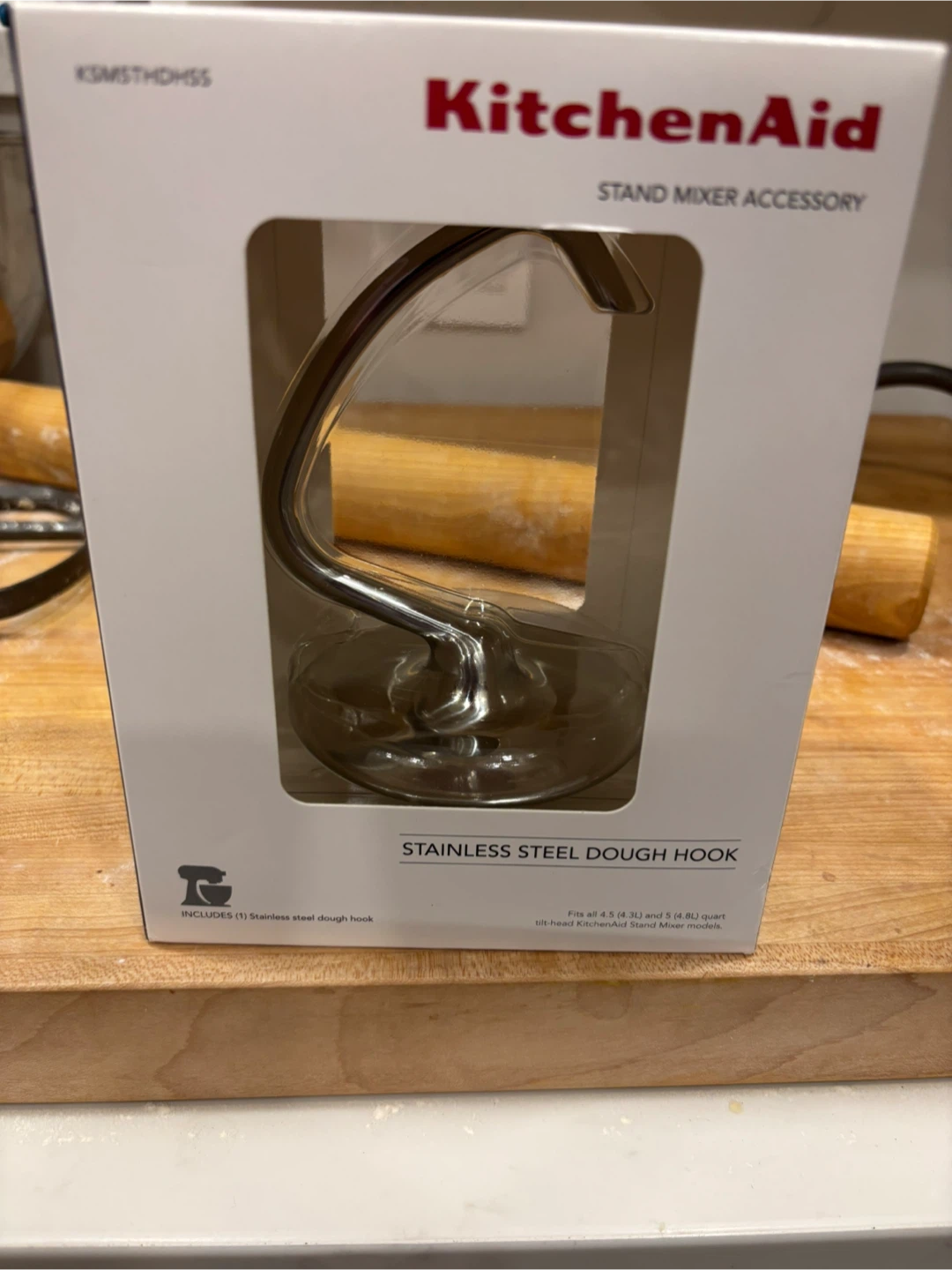 Brand new KitchenAid stainless steel dough hook! This accessory gently kneads and mixes yeast dough, rolls, pizza crust, and more. It's made with 100% stainless steel for long-lasting durability and is dishwasher safe for quick cleanup. Fits all 4.5 (4.3L) and 5 (4.8L) quart tilt-head KitchenAid stand mixers. Box included
