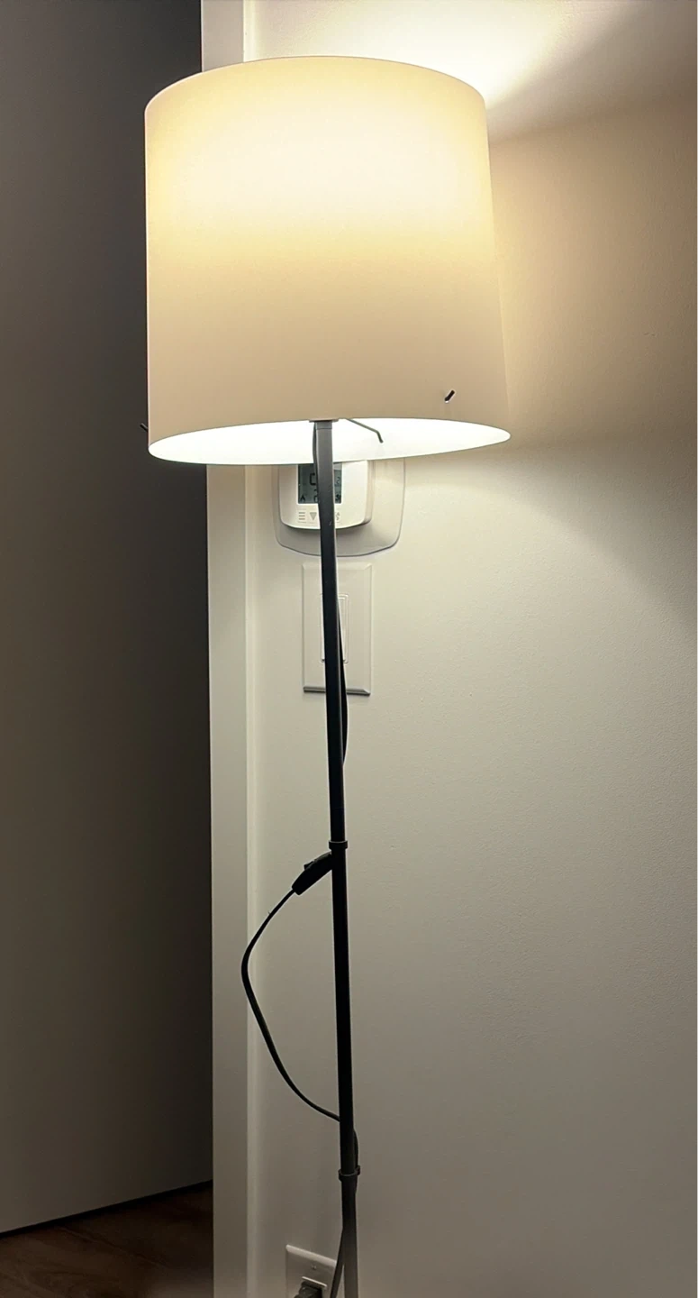 This is a black floor lamp with a neutral cream-coloured lampshade. It's a simple, adjustable lamp. It's great for adding light to any corner of your home.