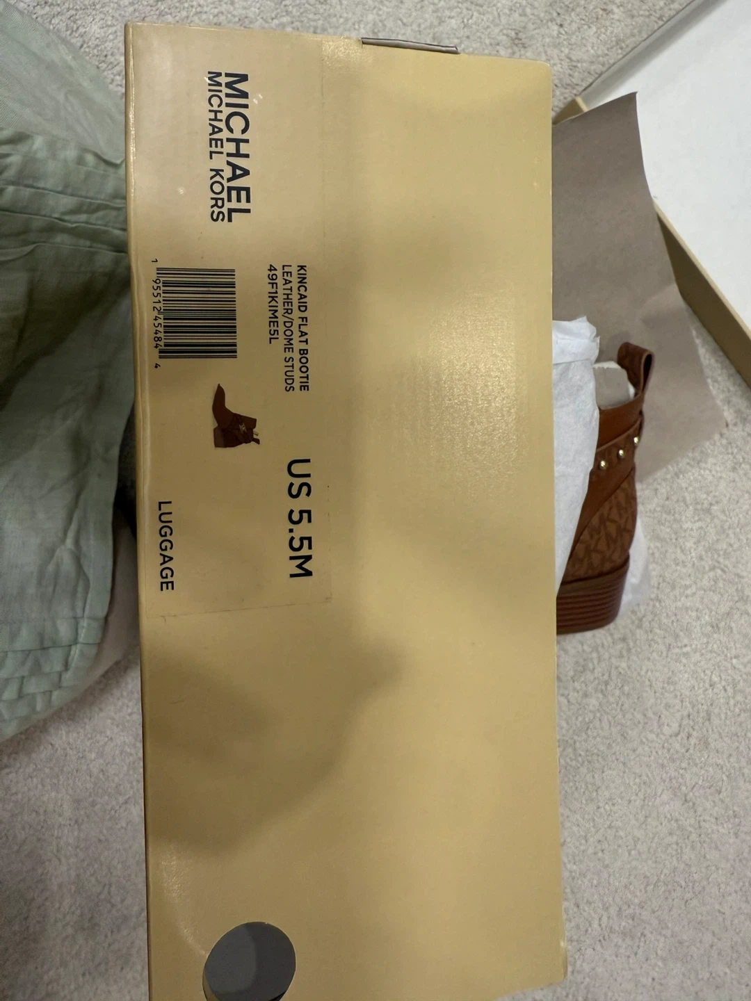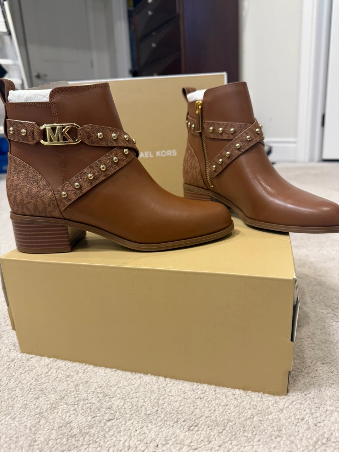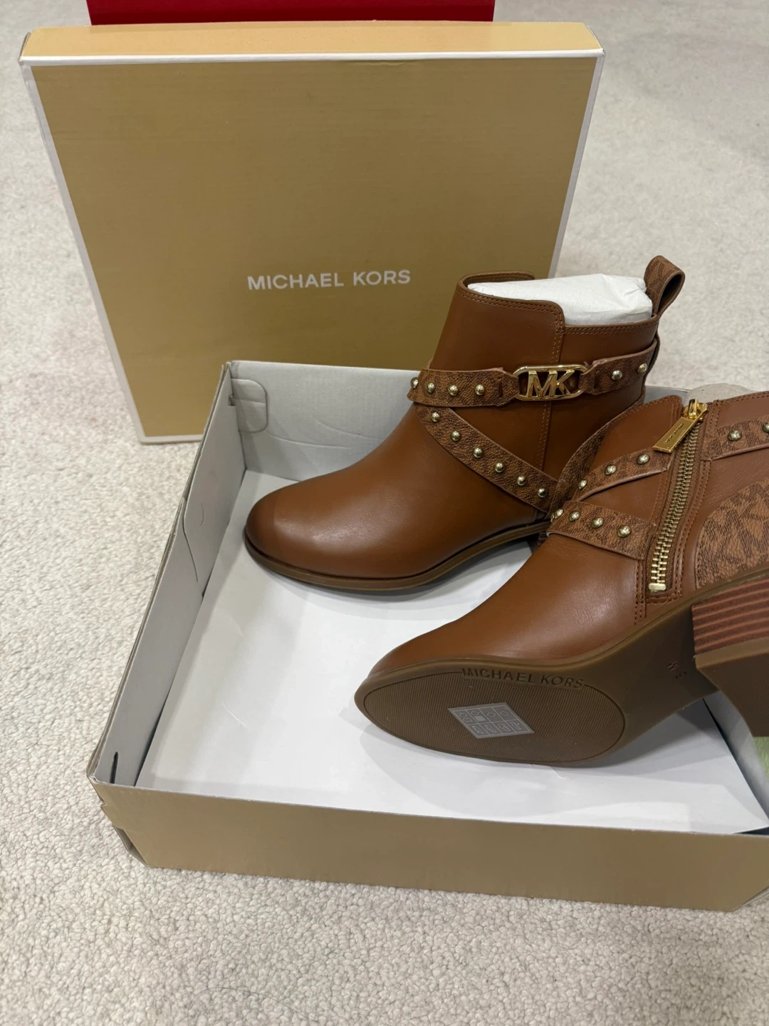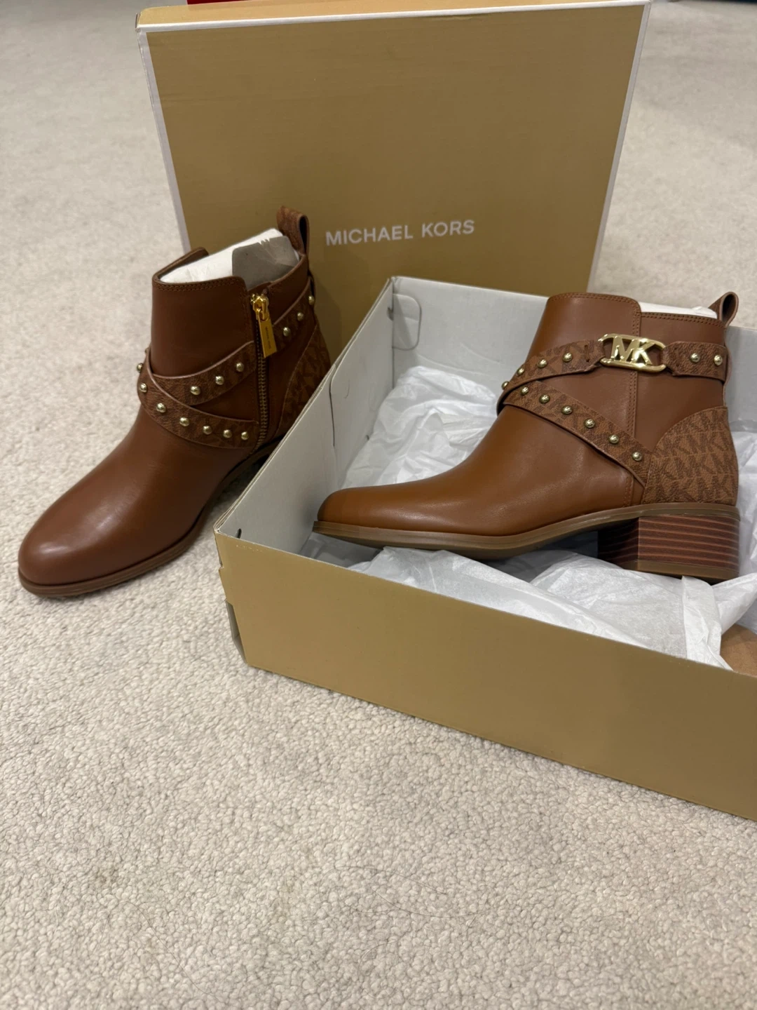 Selling a pair of New Michael Kors Kincaid Flat leather Booties in size 5.5M. These leather/dome stud booties are in new unused condition and come with the original box and all packaging . The colour is Luggage. Perfect addition to your wardrobe or gift to love ones.