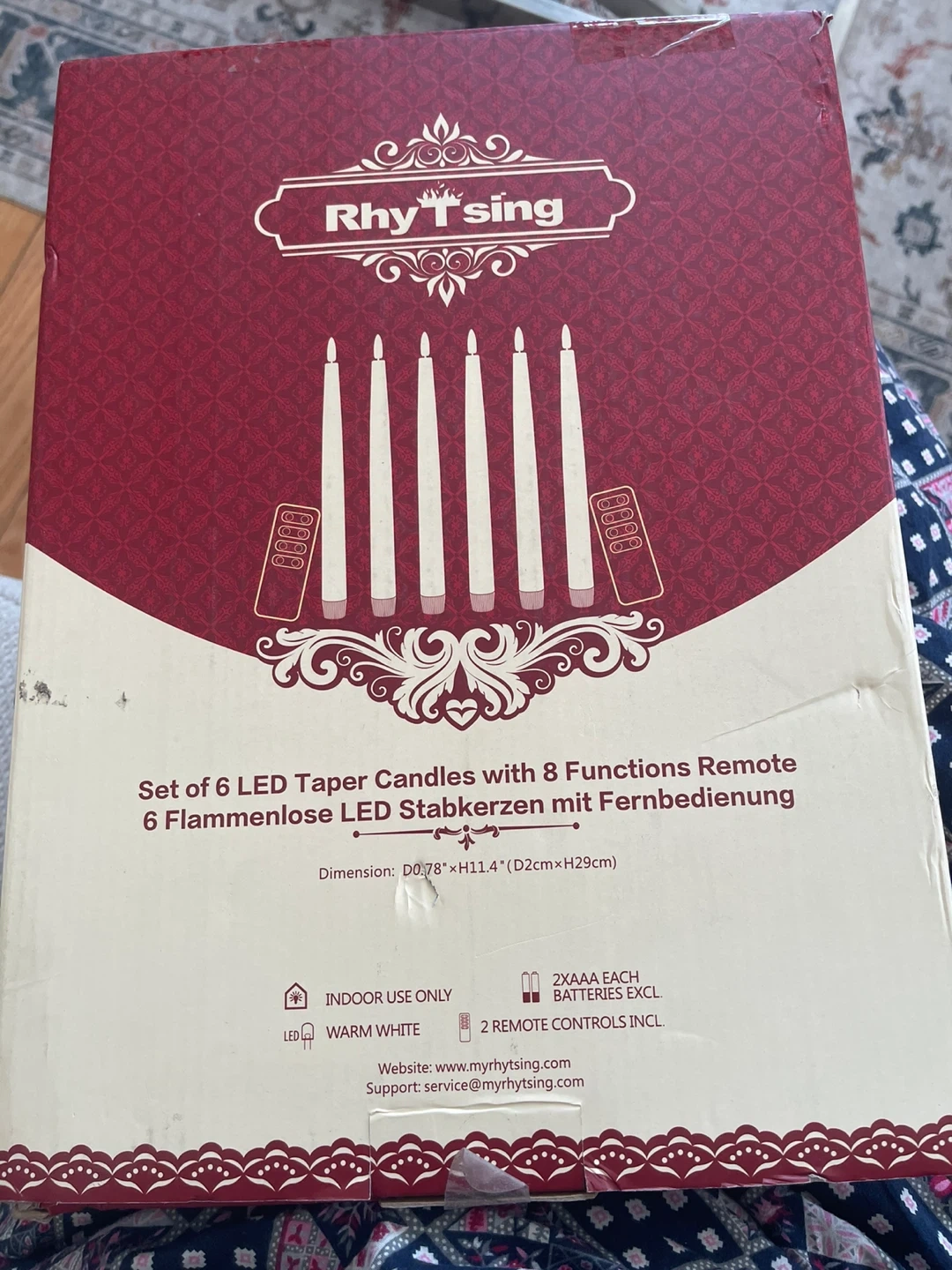 25Selling a set of six Rhytsing LED taper candles, complete with two remote controls. They have eight different functions and give off a warm white light, perfect for creating a cozy atmosphere.