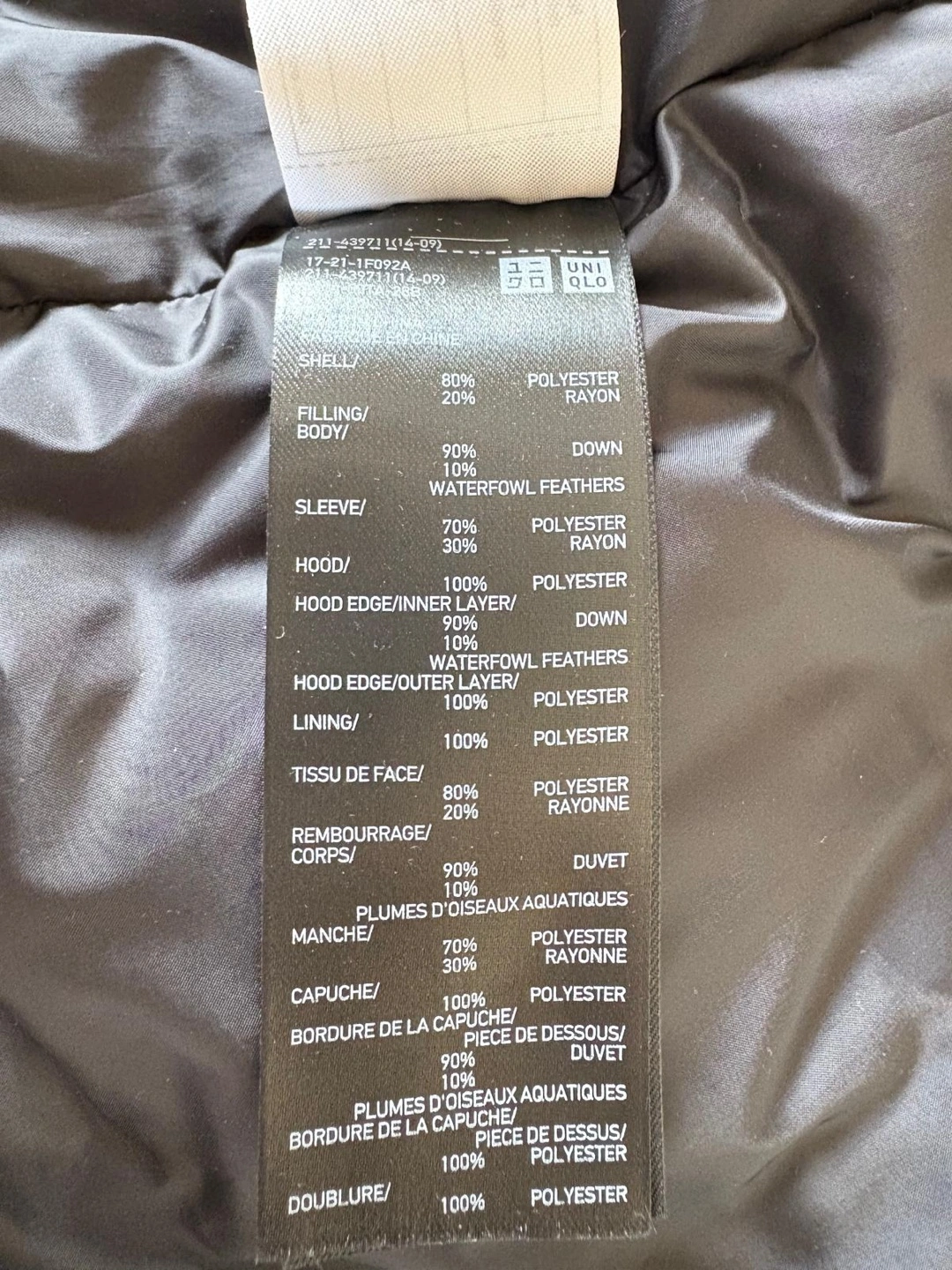 Hood Edge: Outer Layer: 90% Down, 10% Waterfowl Feathers.
