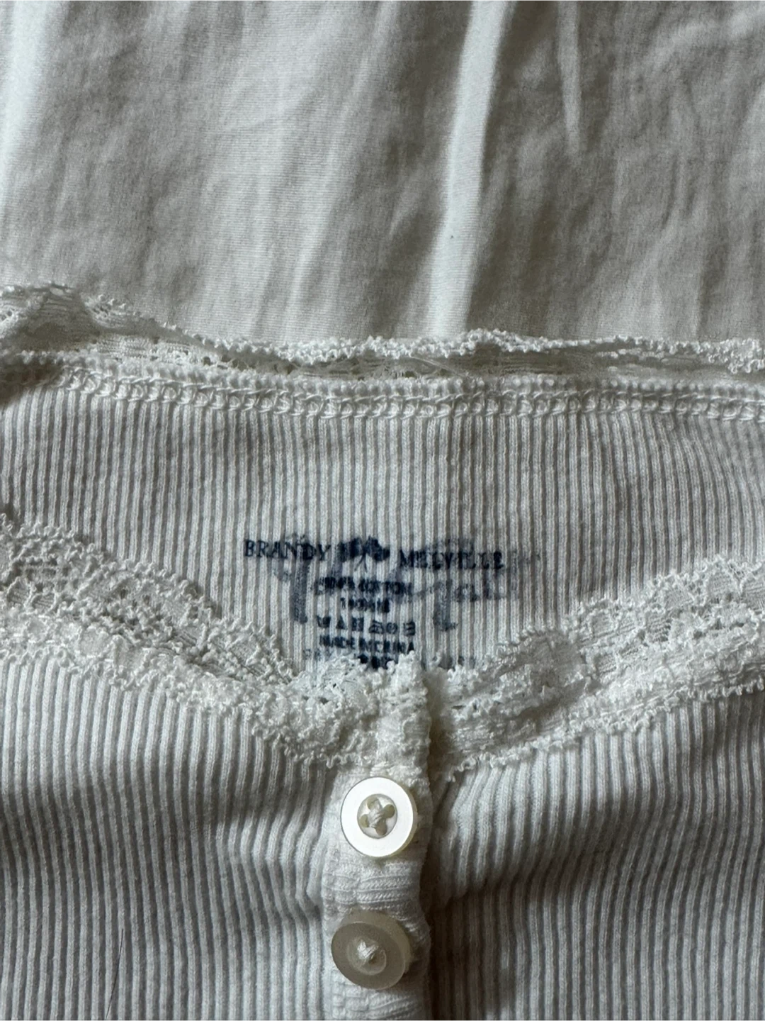 This Brandy Melville camisole top is white and ribbed with delicate lace trim. It has a button-up front detail. 100% cotton material.