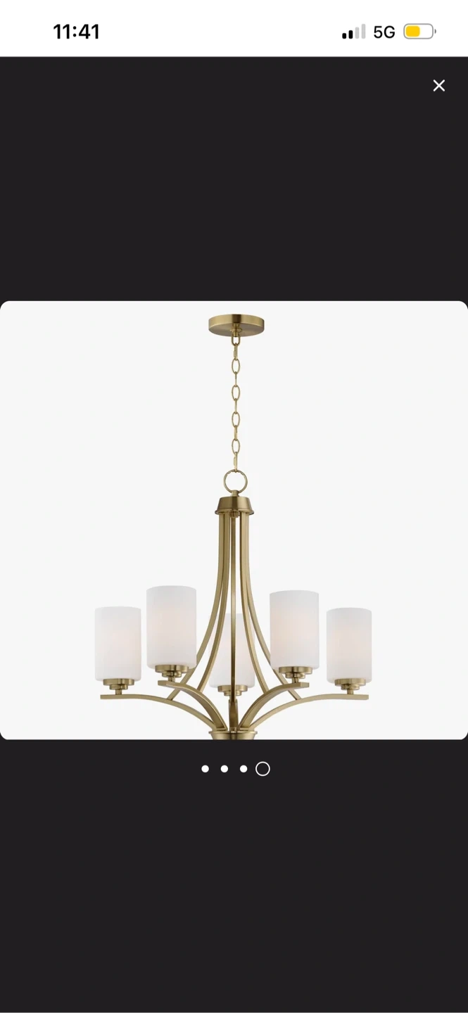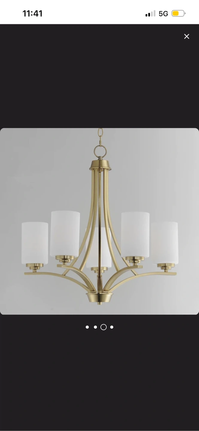 This elegant 5-light chandelier features a warm brass finish and frosted glass shades. It's perfect for adding a touch of style to any dining room or entryway. The fixture comes with a chain for adjustable hanging height.