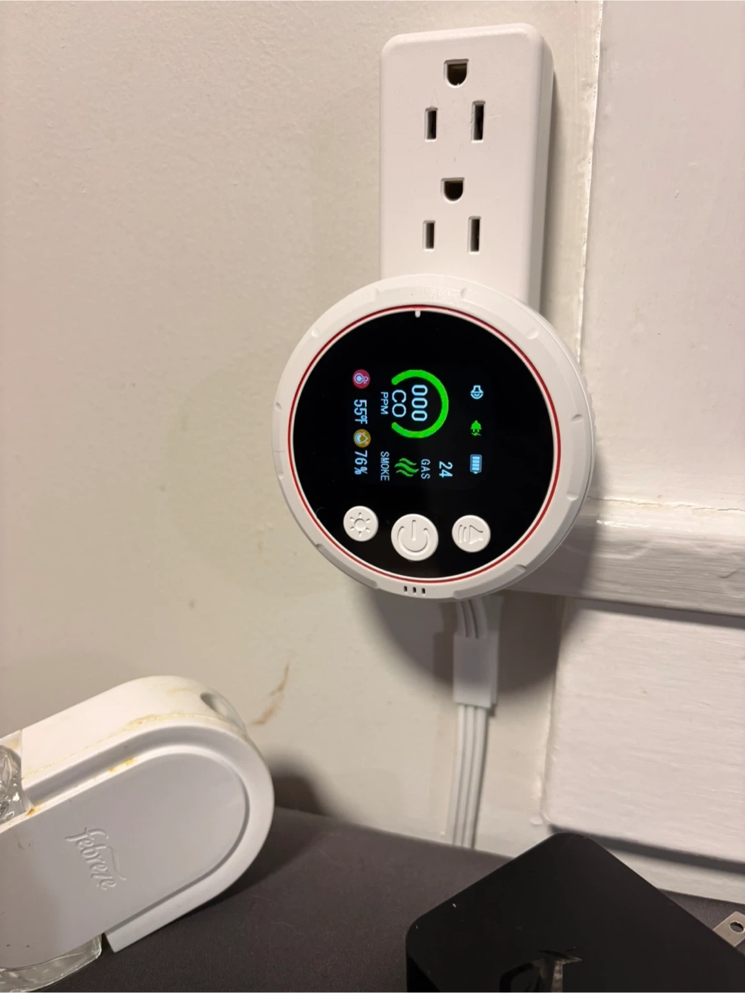 This is a combined smoke, combustible gas, and carbon monoxide alarm. It displays CO PPM, gas levels, smoke detection, temperature, and humidity. The device plugs directly into a standard electrical outlet. Can control everything from your phone.