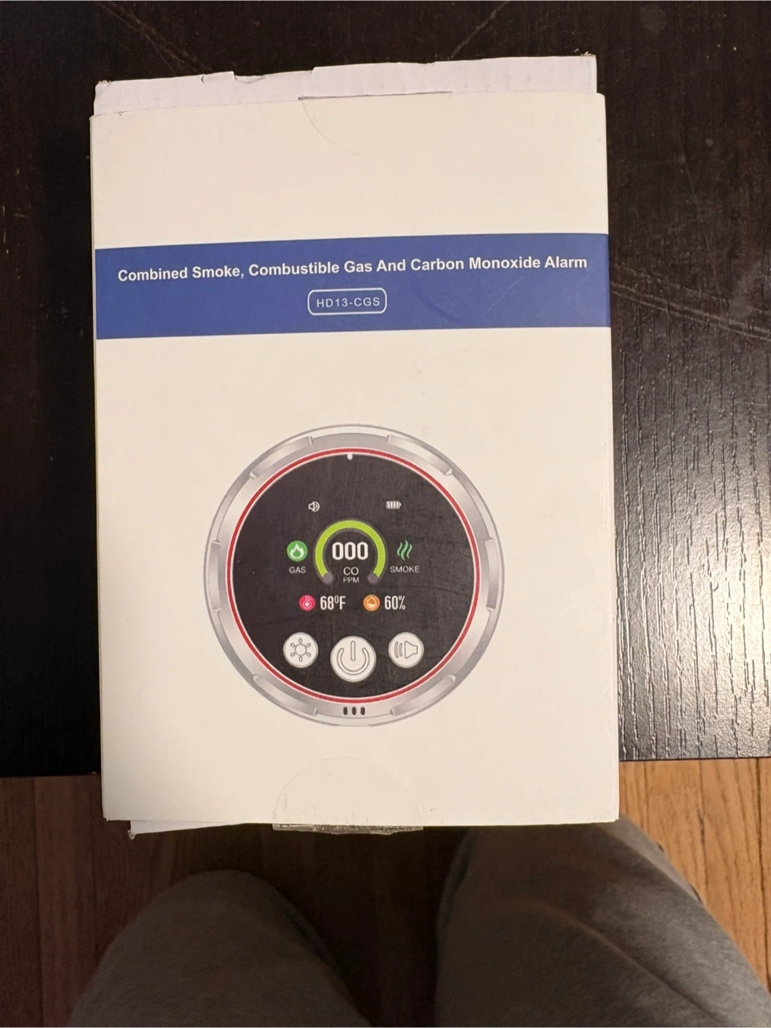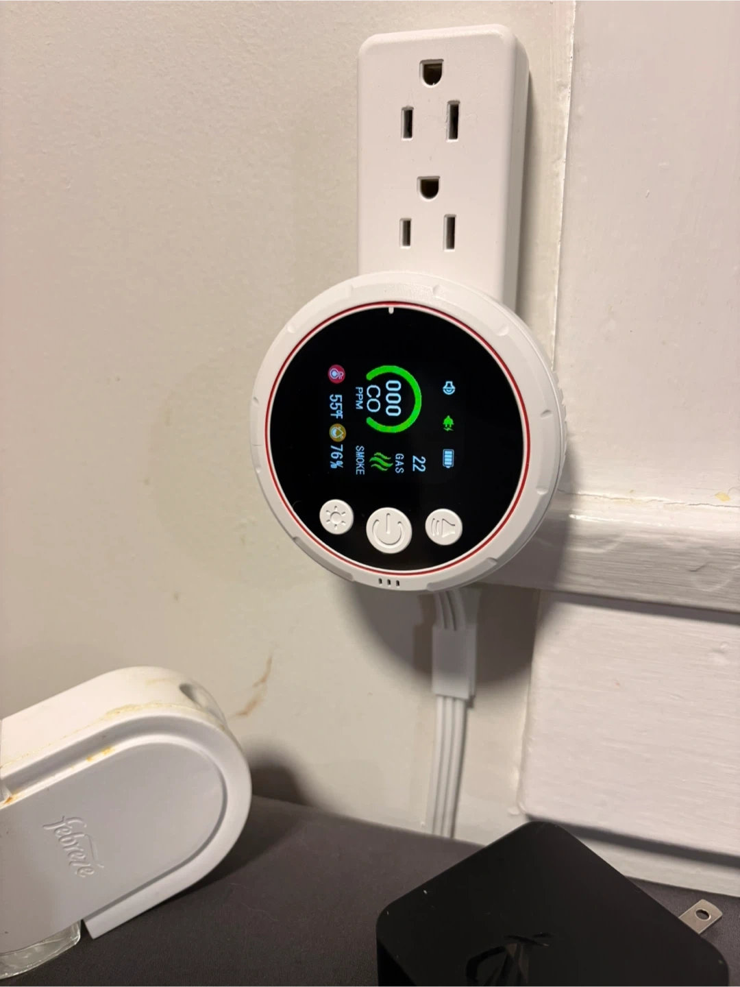This is a combined smoke, combustible gas, and carbon monoxide alarm. It displays CO PPM, gas levels, smoke detection, temperature, and humidity. The device plugs directly into a standard electrical outlet. Can control everything from your phone.