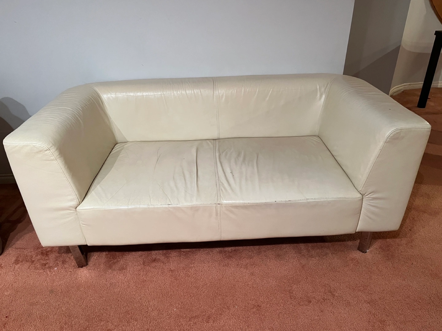 White leather loveseat with chrome legs. Two-seater sofa with clean lines and simple design.