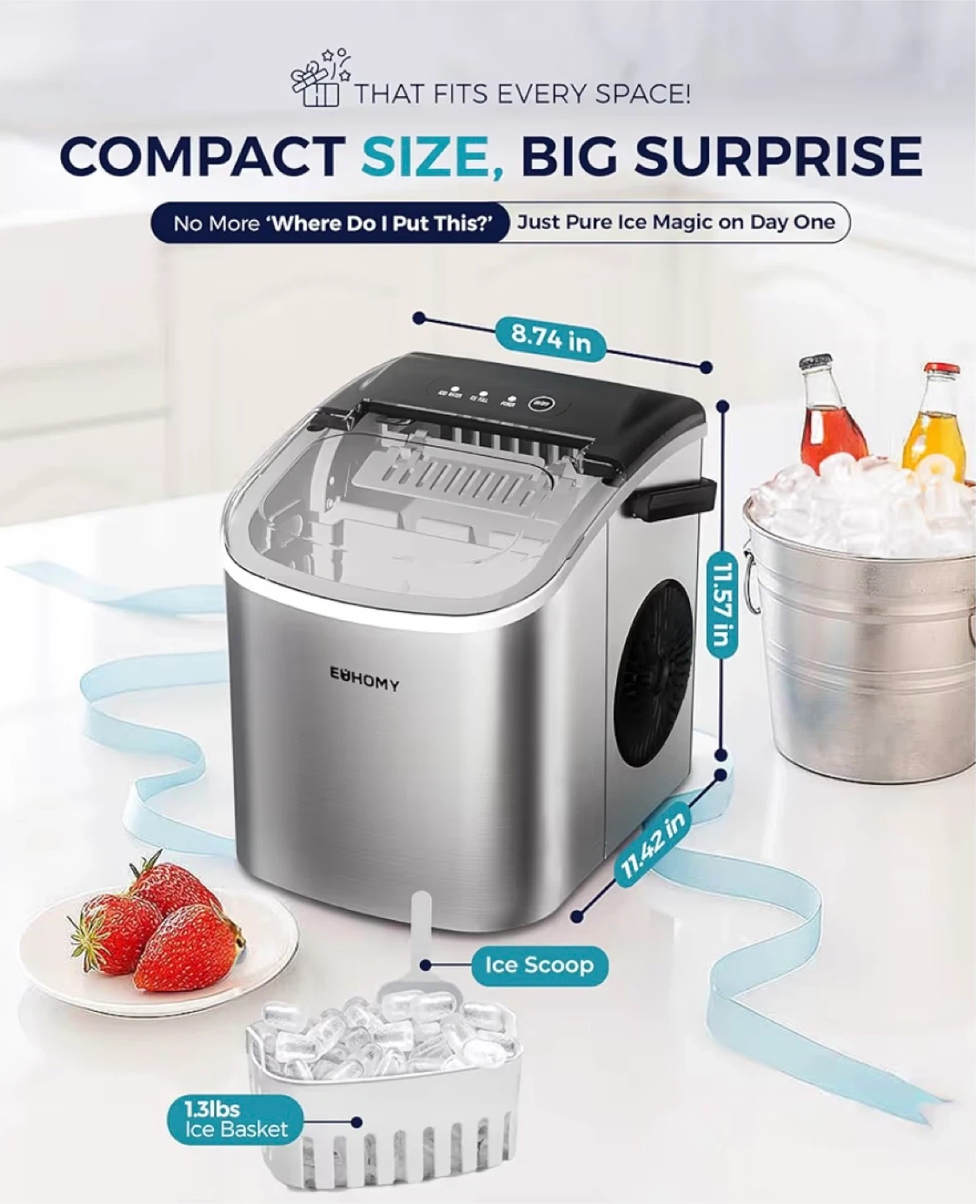 This EUHOMY ice maker creates ice in just 6 minutes. It's compact and comes with an ice scoop and a 1.3lbs ice basket. The dimensions are 8.74 x 11.57 x 11.42 inches.