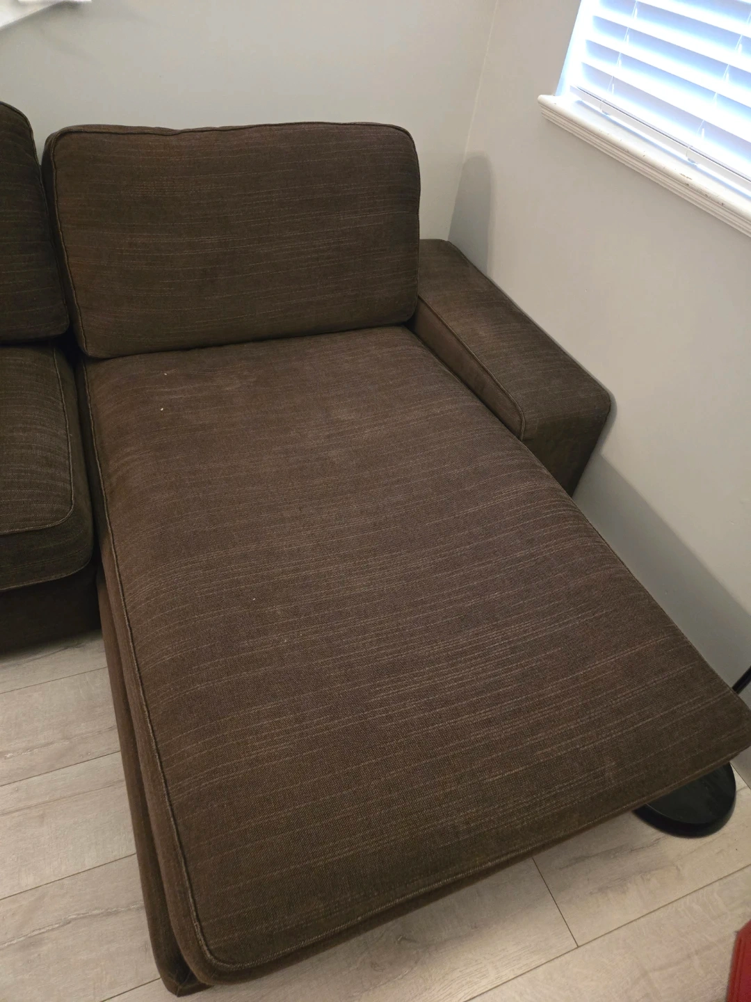 This is a comfortable brown sectional sofa with a chaise lounge. The fabric has a textured weave. It's perfect for a living room or den.
