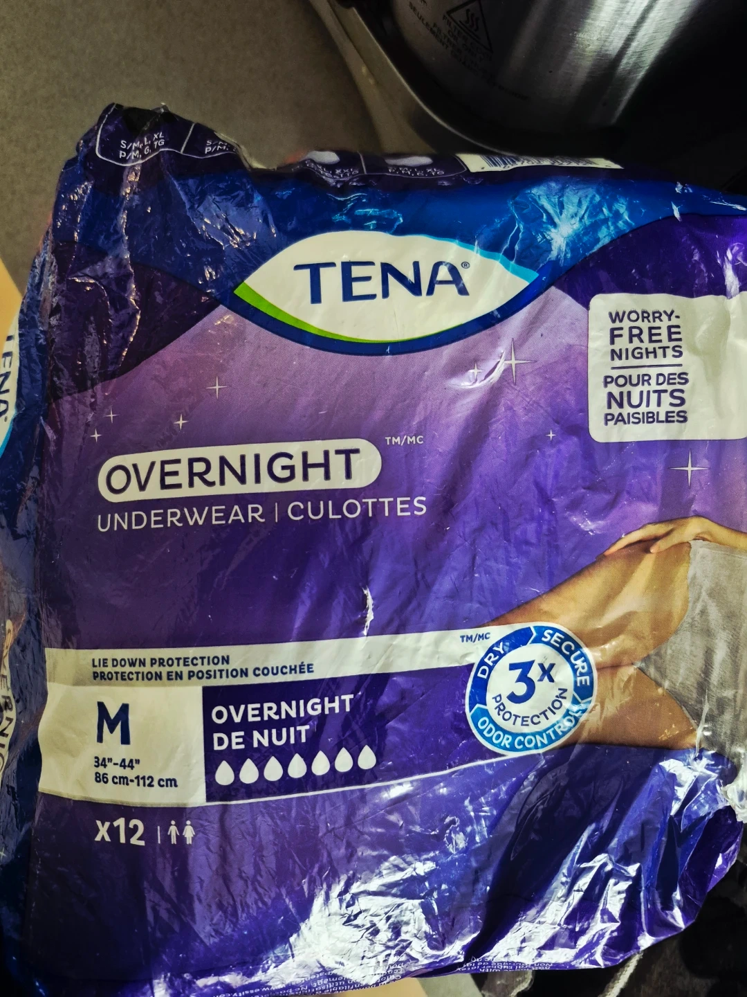 Tena Overnight Underwear in size medium. These culottes offer worry-free nights with 3x protection and odor control. Designed for lie-down protection. 12 per pack.