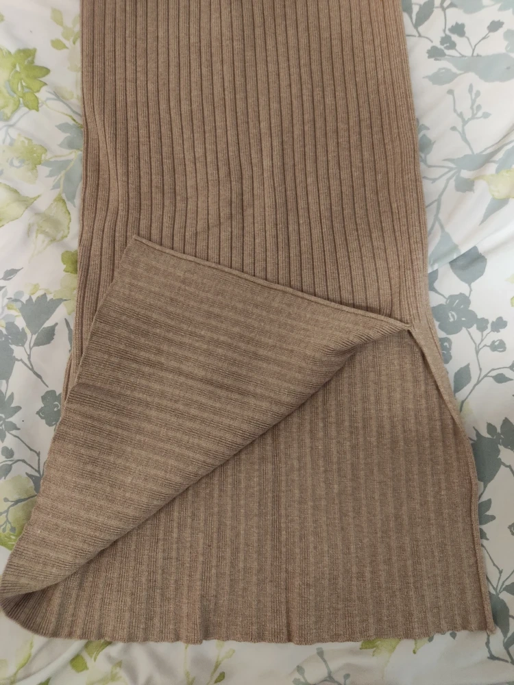 A lovely ribbed knit midi skirt in a neutral beige colour! It has a comfortable fit and a stylish slit on the side. Perfect for any occasion!