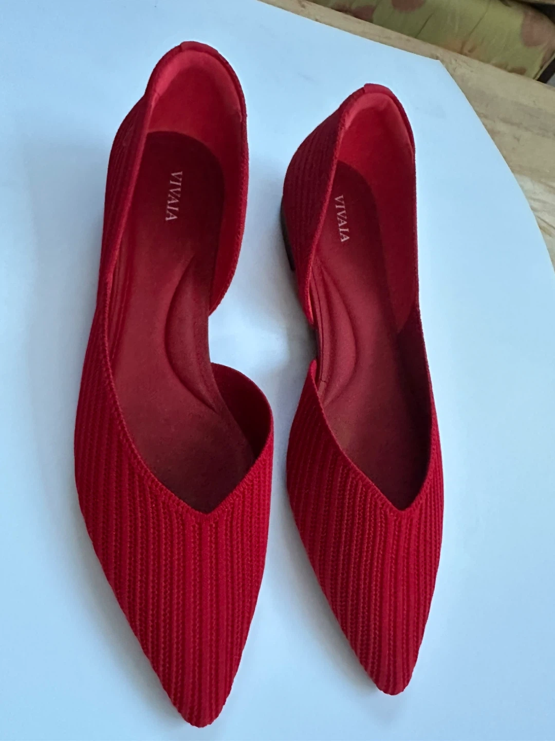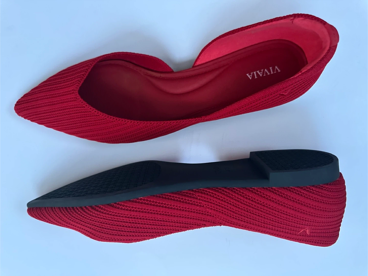 VIVAIA red knit pointed toe flats. Knit upper, cushioned insole. These flats are very comfortable … a versatile choice for everyday spring wear.
