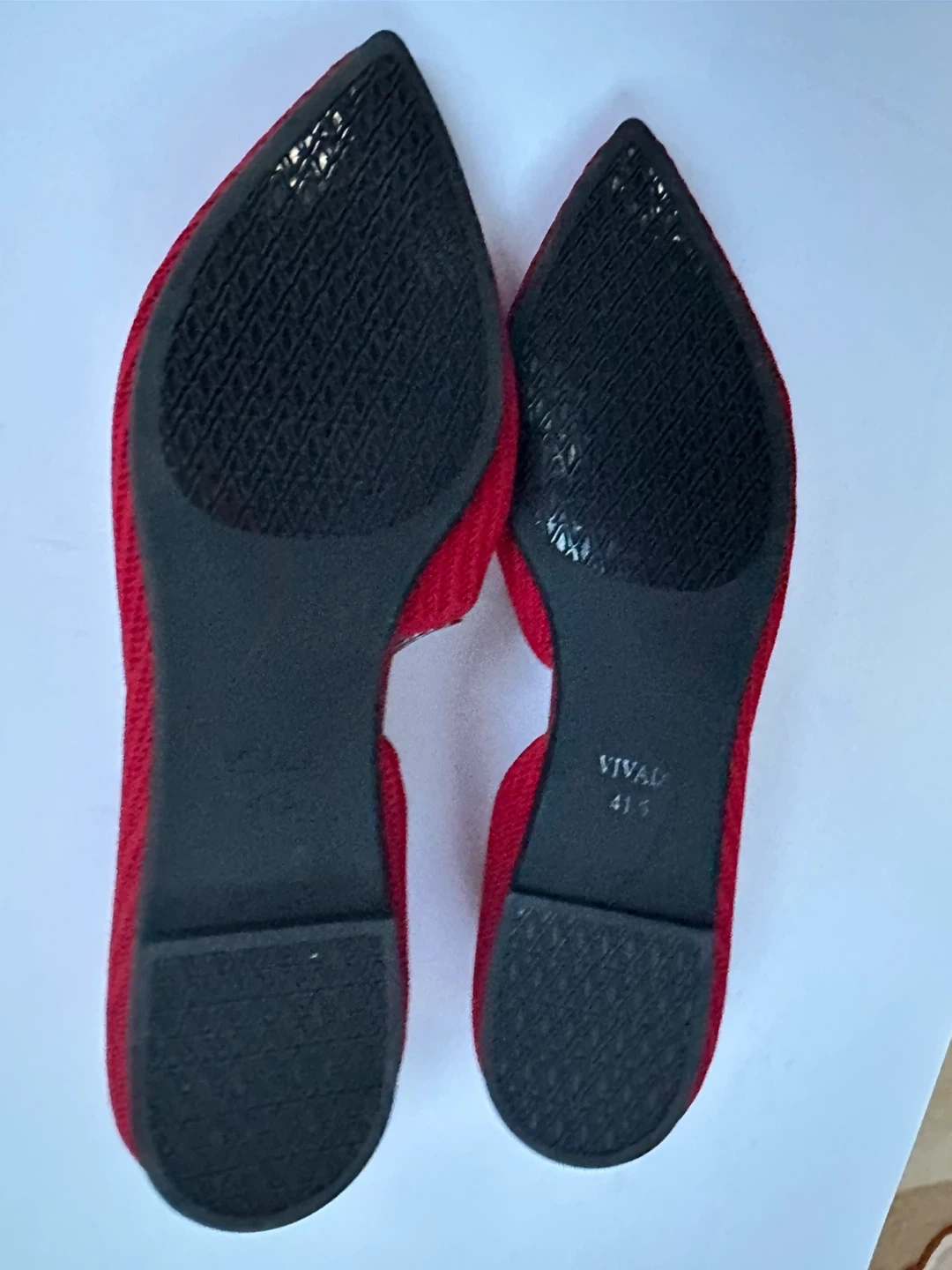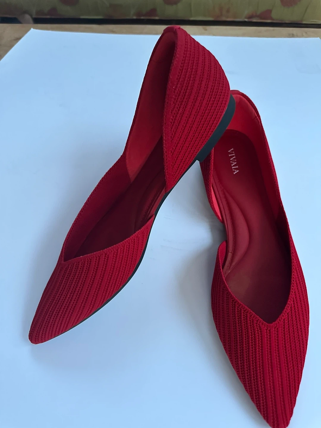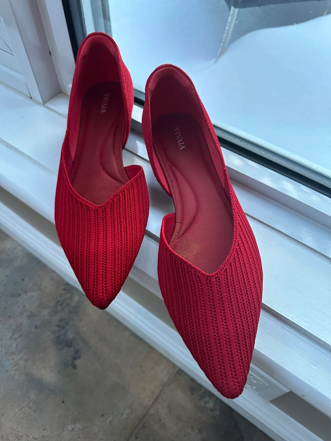 VIVAIA red knit pointed toe flats. Knit upper, cushioned insole. These flats are very comfortable … a versatile choice for everyday spring wear.