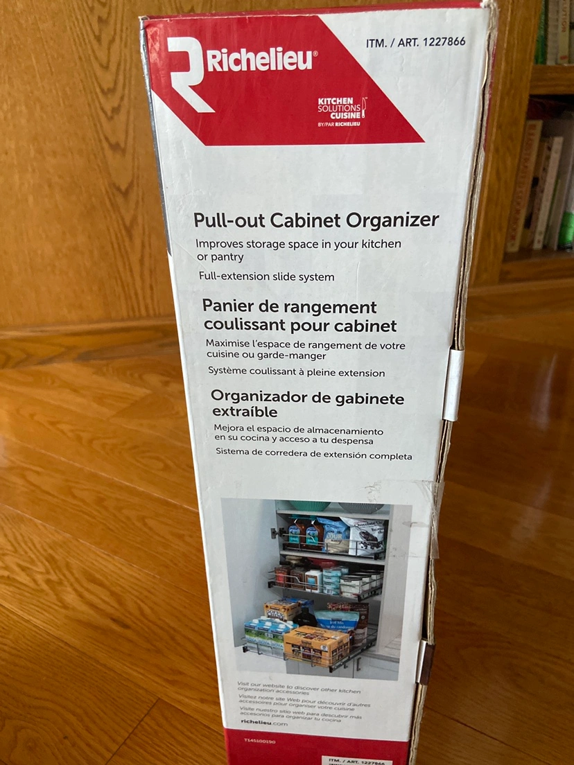 This is a pull-out cabinet organizer. It is in its original packaging. It comes with full-extension slide system. It is chrome finished and is 20" wide and 22" deep. It is a Richelieu brand item. Pick up Meadowvale and Lawrence area. Cash only.