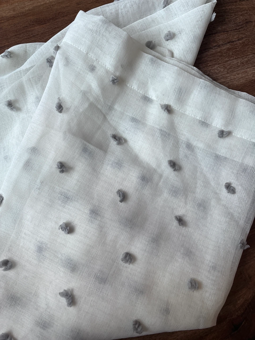 Sheer white curtains with a subtle grey pom-pom texture. These light and airy panels add a touch of charm to any room. Material is lightweight fabric. Both curtains included.