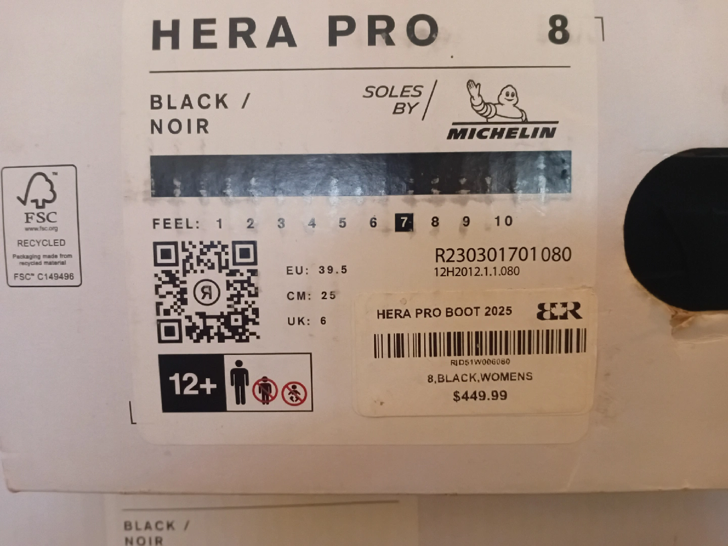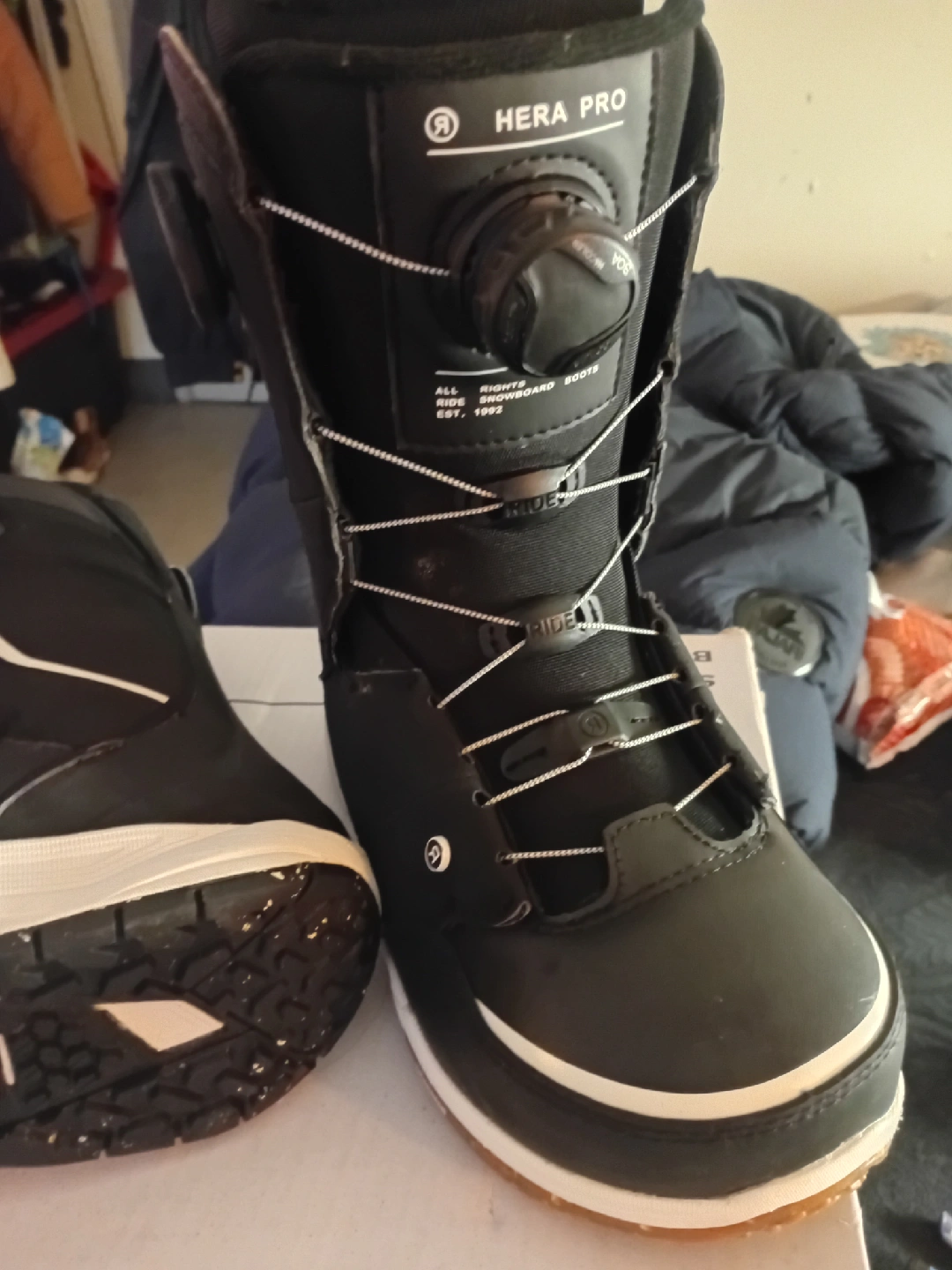 10Selling a pair of Ride Hera Pro snowboard boots for women in size 8. These black boots feature soles by Michelin and are designed for comfort and performance on the slopes. The box is included!