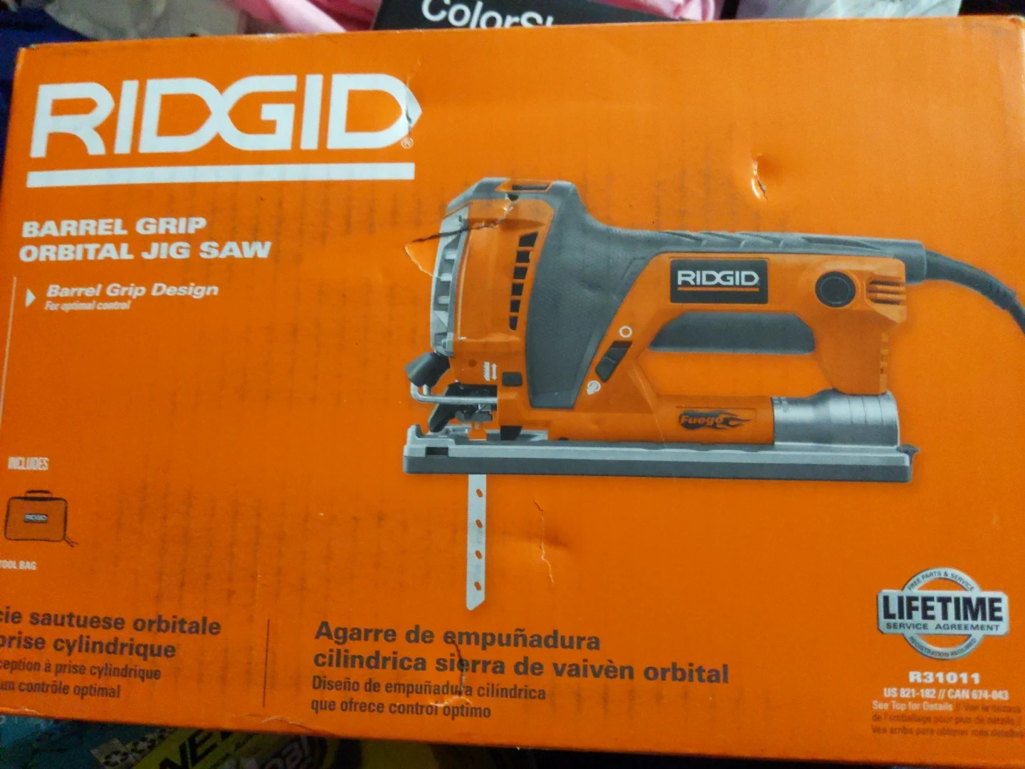 10Selling a brand new Ridgid Barrel Grip Orbital Jig Saw, still in its original box! It features a barrel grip design for optimal control. Includes: - Barrel Grip Orbital Jig Saw - Hex key - Blade - Tool bag - Operator's manual