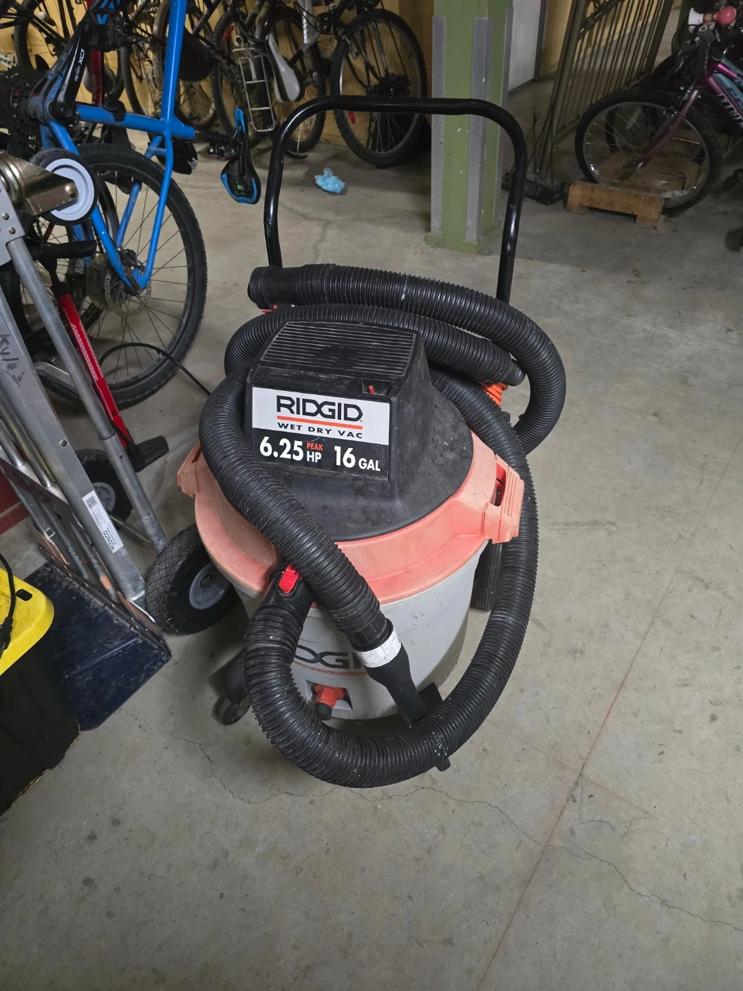 60Selling a Ridgid wet dry vac, it's a 6.25 HP motor and has a 16 gallon capacity. It's in good condition and ready to help with any cleaning tasks!