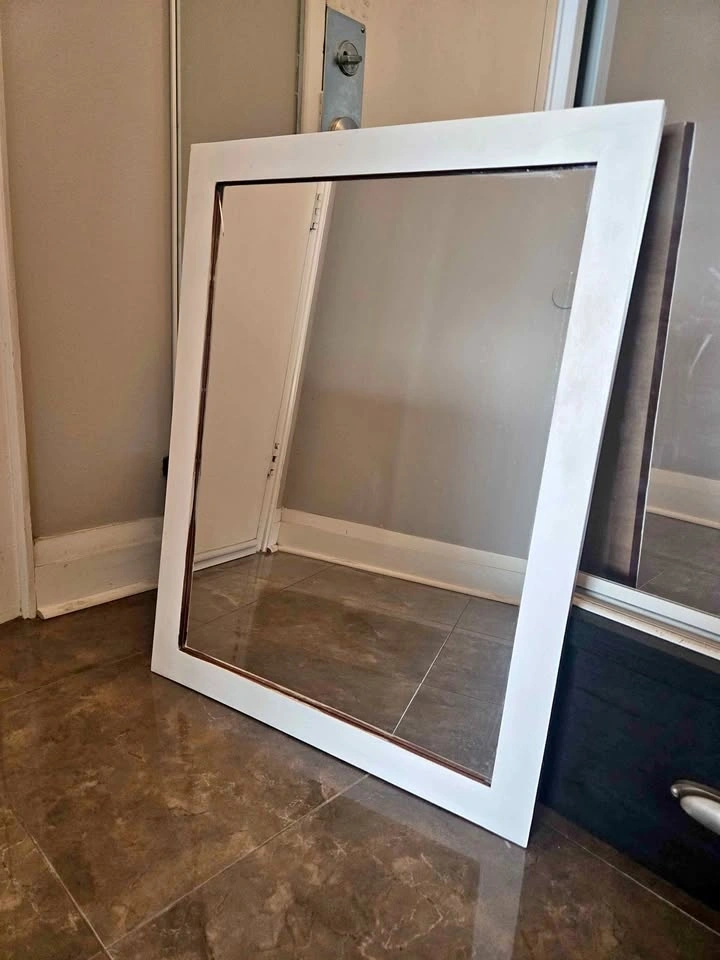 1) Rectangular wall mirror with white wooden frame in very good condition. Can be used vertically or horizontally. Size 31"x24". For $15 cash.