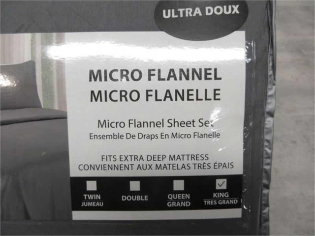 This dark grey, ultra-soft micro flannel 4PC king sheet set is new in packaging. It fits extra deep mattresses and will be a cozy addition to any bedroom.