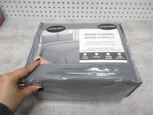 This dark grey, ultra-soft micro flannel 4PC king sheet set is new in packaging. It fits extra deep mattresses and will be a cozy addition to any bedroom.