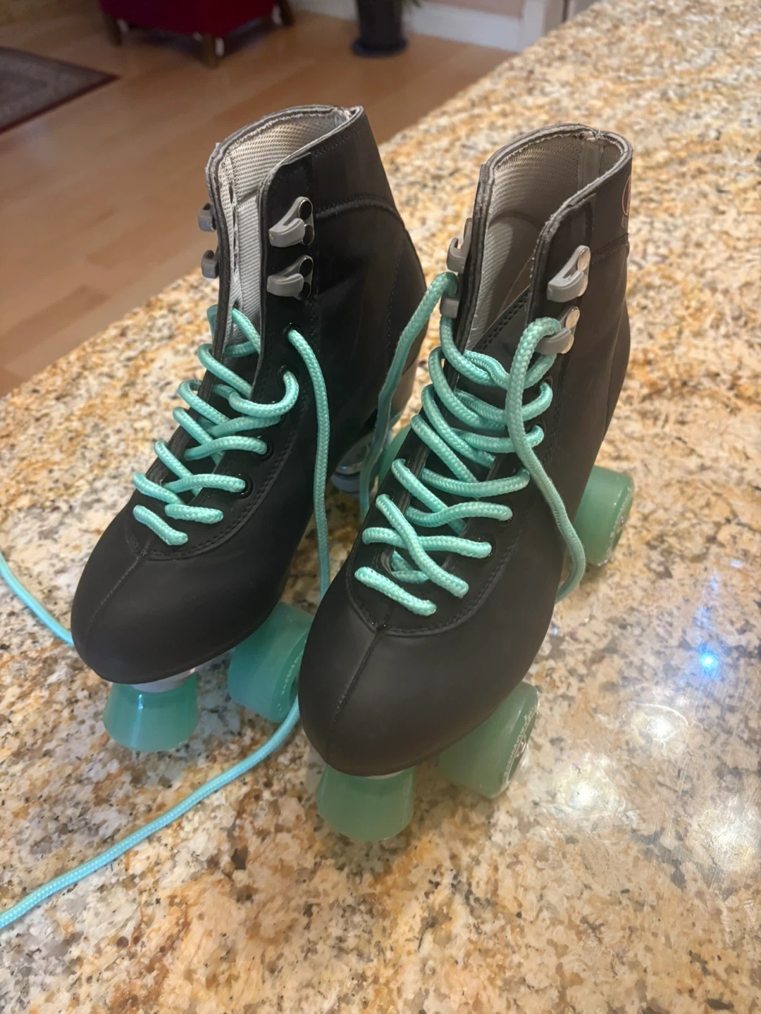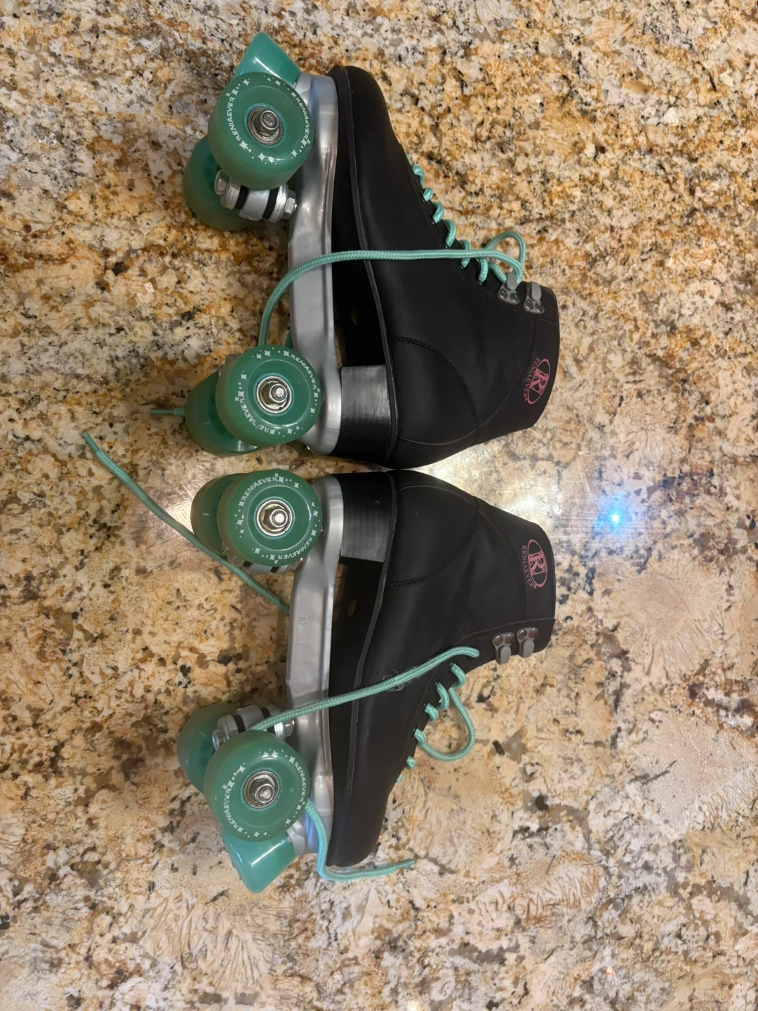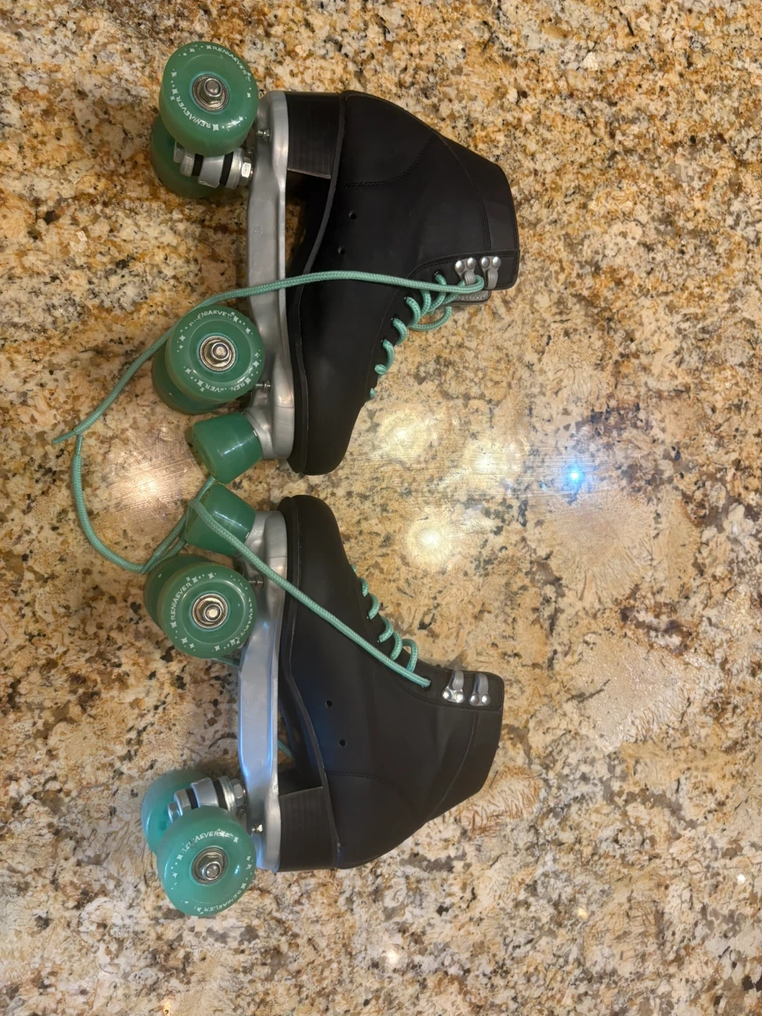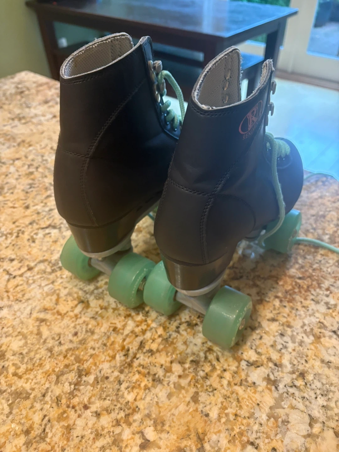 Selling a pair of cool size 41 roller skates! They are black with light green wheels and laces. These skates are in great condition and ready for some fun at the rink or on the street