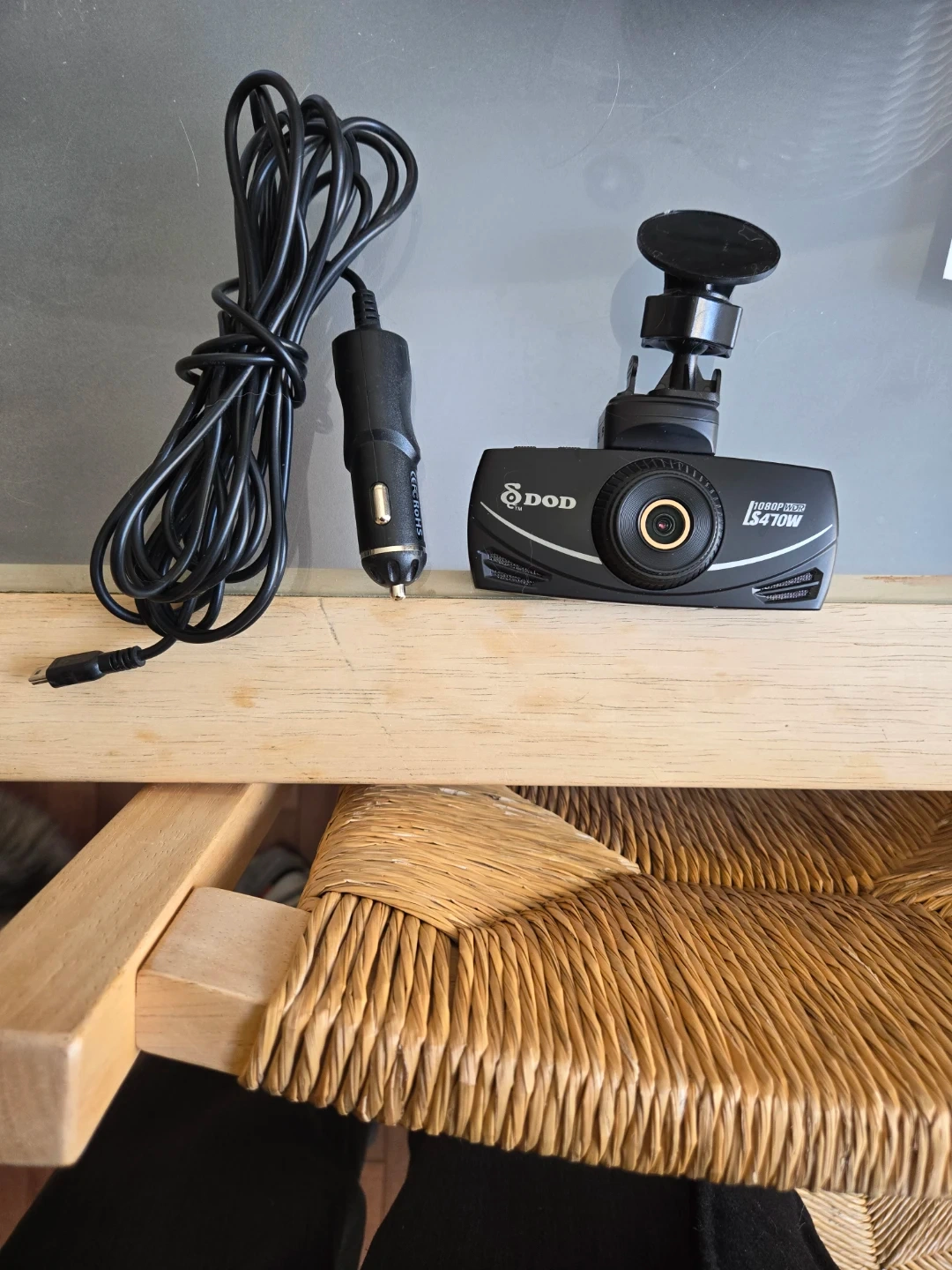 DOD LS470W dash cam with 1080P resolution and WDR technology. Includes power cable and car charger. Records clear footage for your drives.