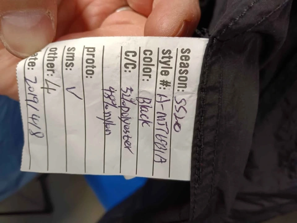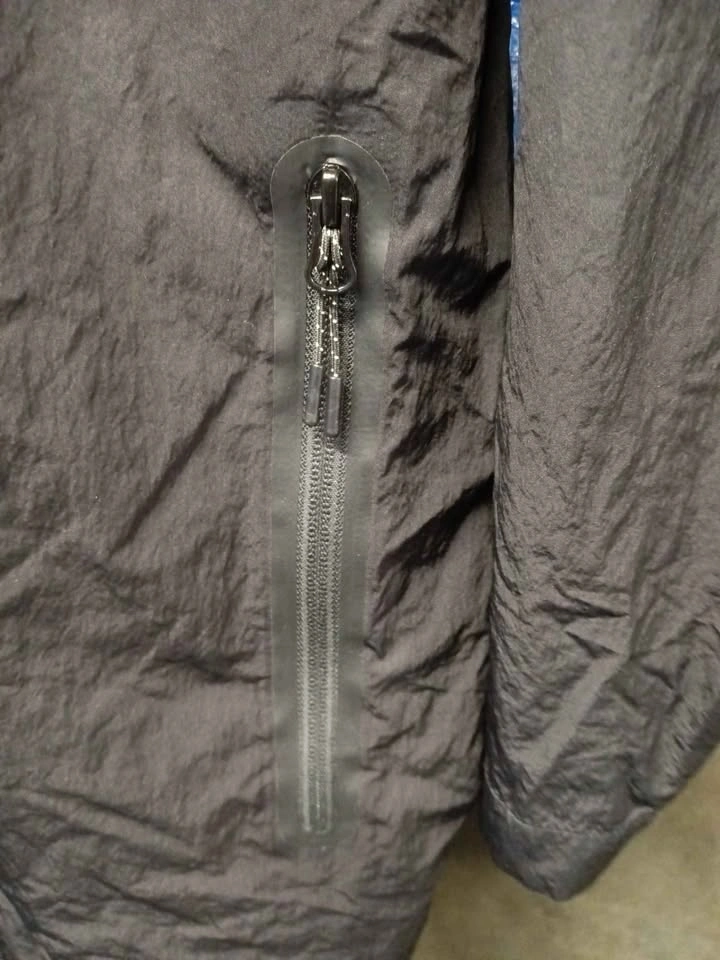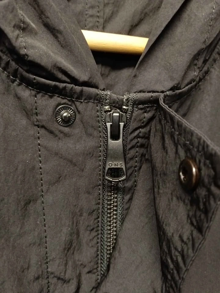 Black O.N.S hooded jacket, size medium. Material has a technical, slightly crinkled texture. Features a full front zipper with a snap-button storm flap. Two vertical zippered hand pockets. Hood is attached and non-removable.