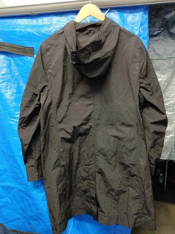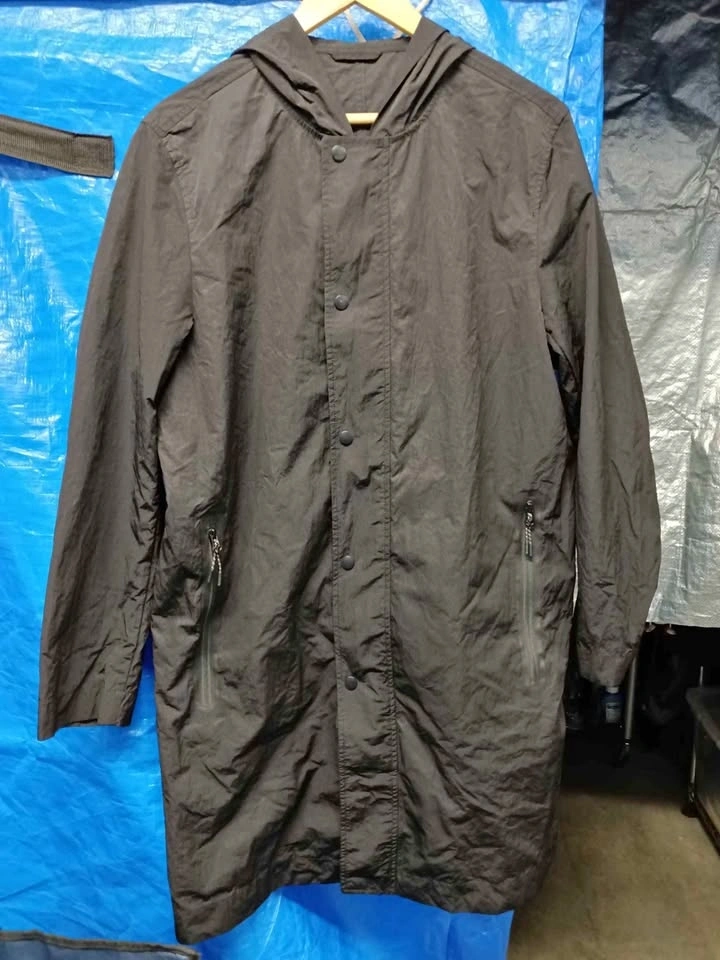 Black O.N.S hooded jacket, size medium. Material has a technical, slightly crinkled texture. Features a full front zipper with a snap-button storm flap. Two vertical zippered hand pockets. Hood is attached and non-removable.