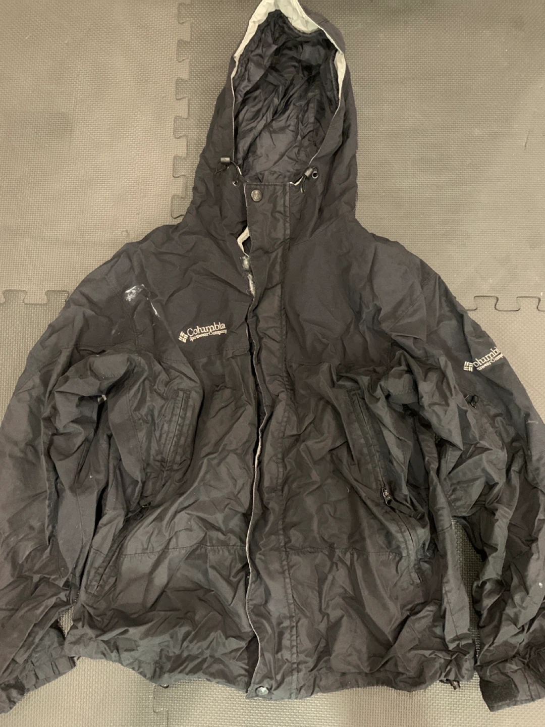 Columbia Sportswear Company jacket in black. It features a hood and zippered pockets. This jacket is great for outdoor activities.