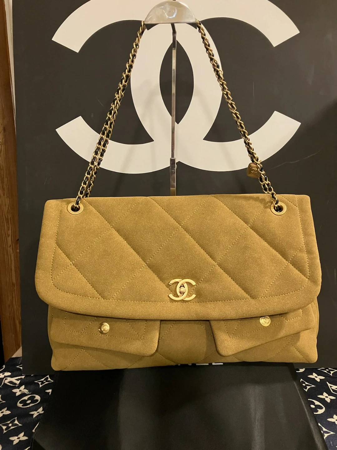 This is a Chanel flap bag in a rich brown suede material. It features the classic diamond quilting and a gold-tone CC logo closure. The chain strap is accented with black leather.