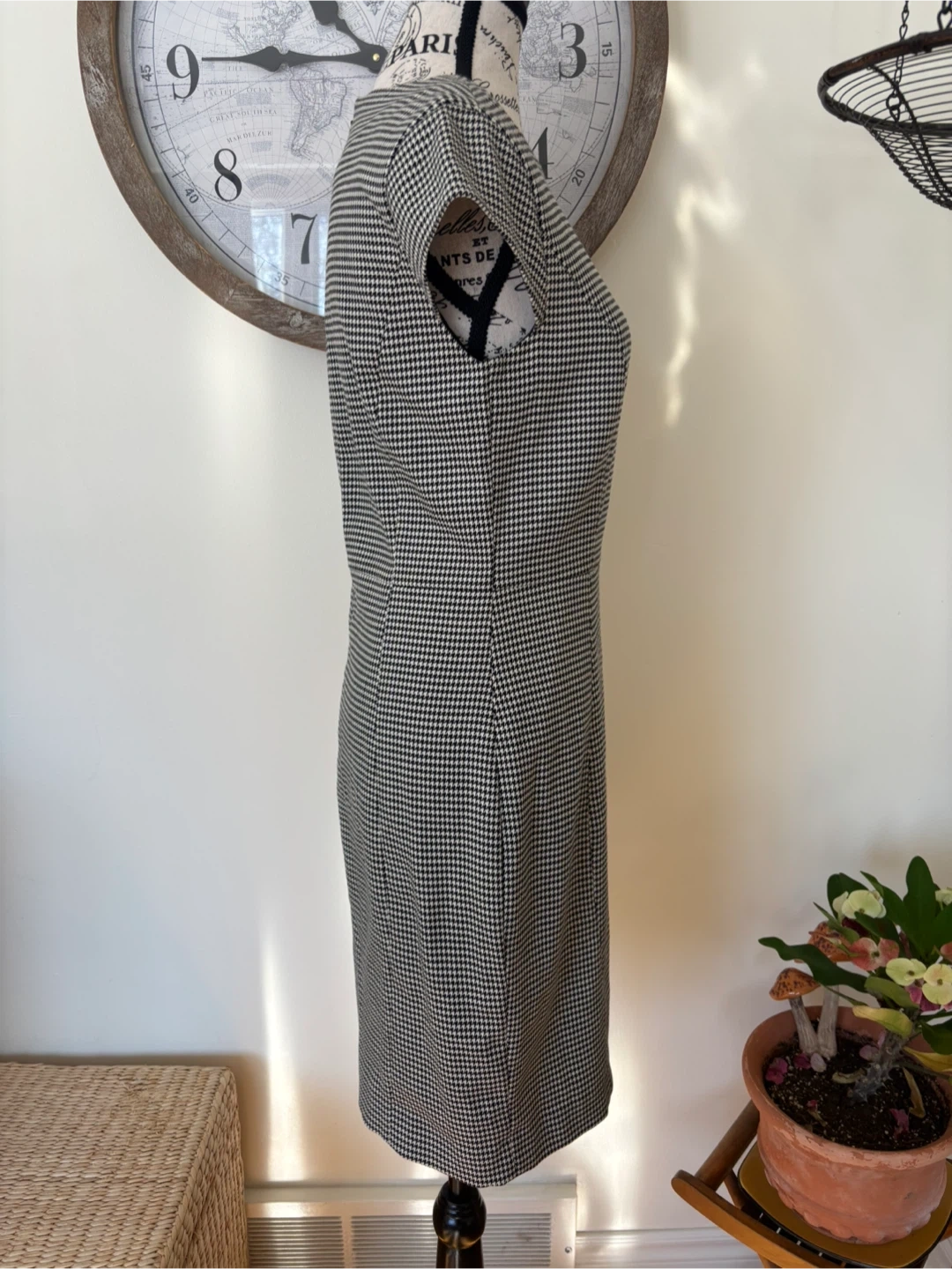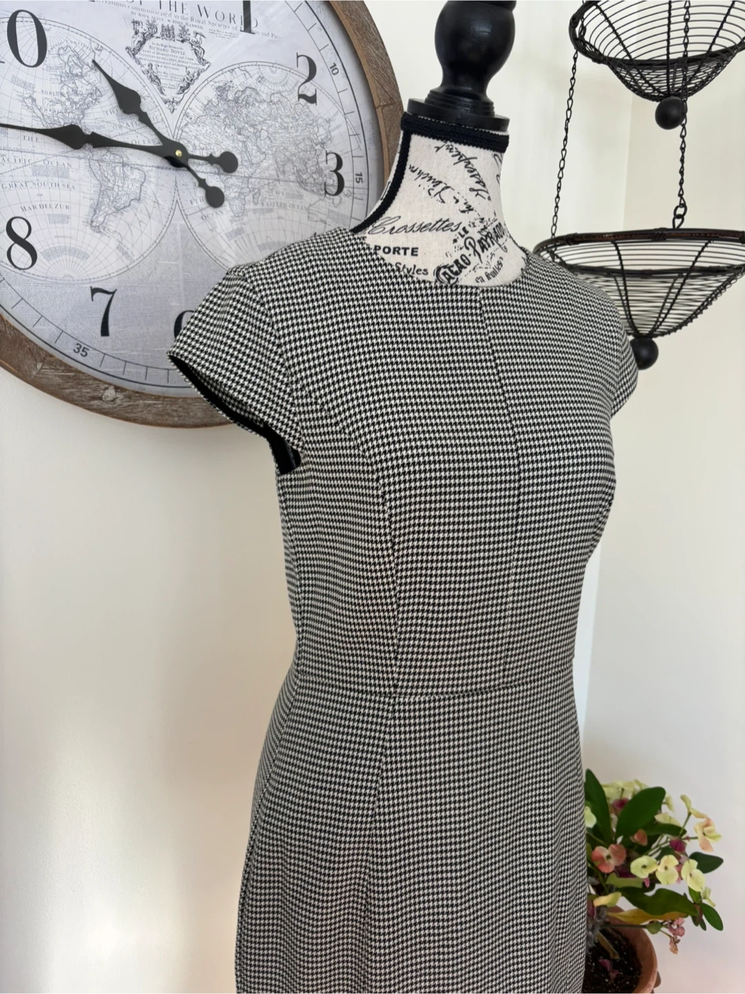 This classic houndstooth sheath dress features a flattering silhouette. It's perfect for business casual settings or a polished evening out. I got it in Portugal. Internally lined as well. Size 6. Cash only.