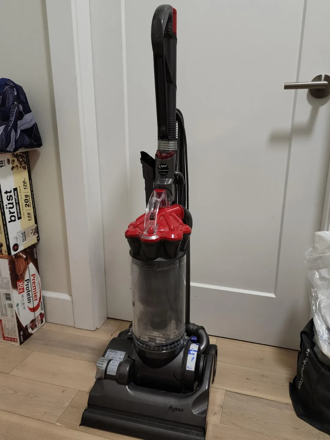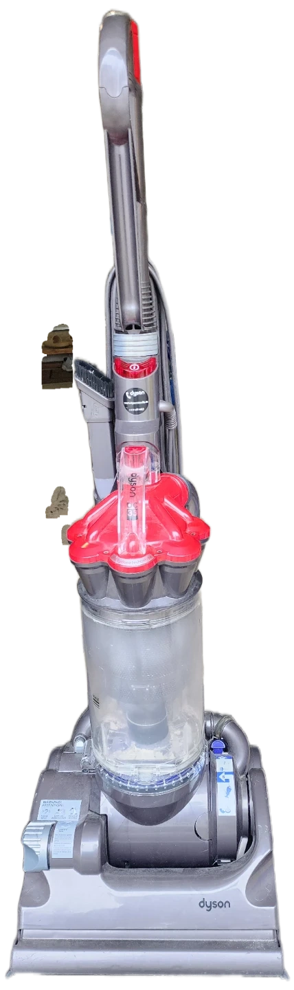 This is a Dyson Ball vacuum cleaner. It's a upright model with a clear bin. It comes with a brush tool attachment.