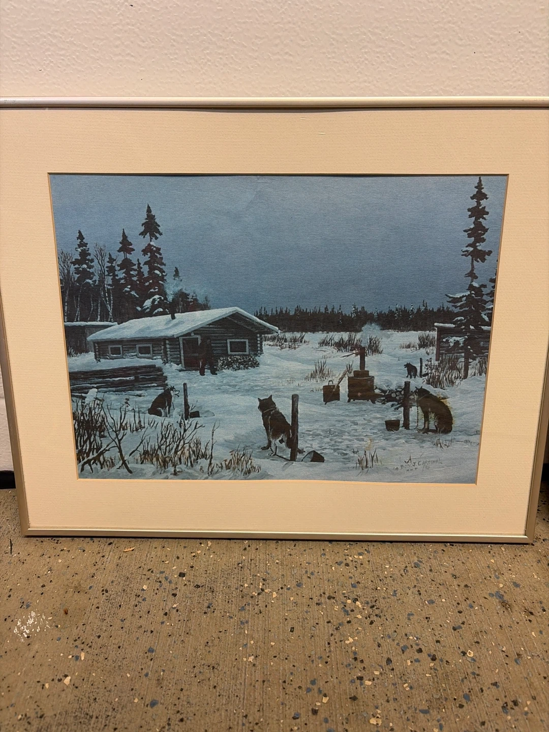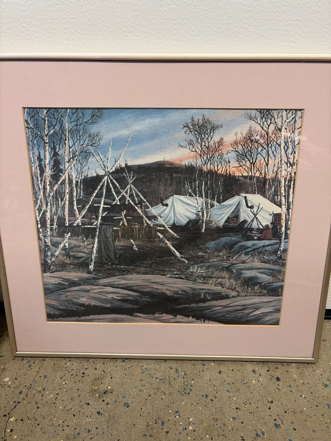 Two framed art prints depicting Canadian wilderness scenes. One shows a winter cabin with dogs, the other a tipi camp with birch trees. Both are matted and framed. Perfect for adding a touch of Canadian art to your home! Indigenous artist Don j cardinal circa 1983