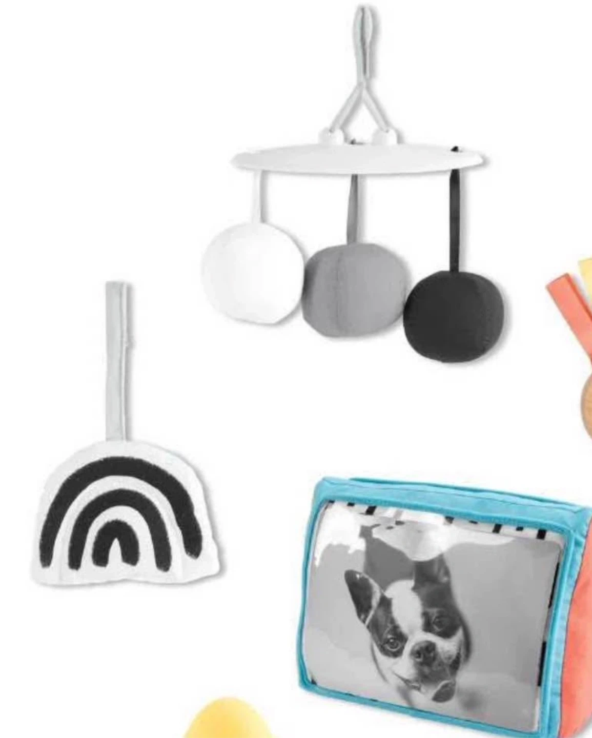 This Skip Hop activity gym features a wooden arch and various developmental toys. It includes a soft, quilted mat with a rainbow and abstract pattern. The gym comes with a mirror, a crinkle toy, and a mobile with soft balls.
