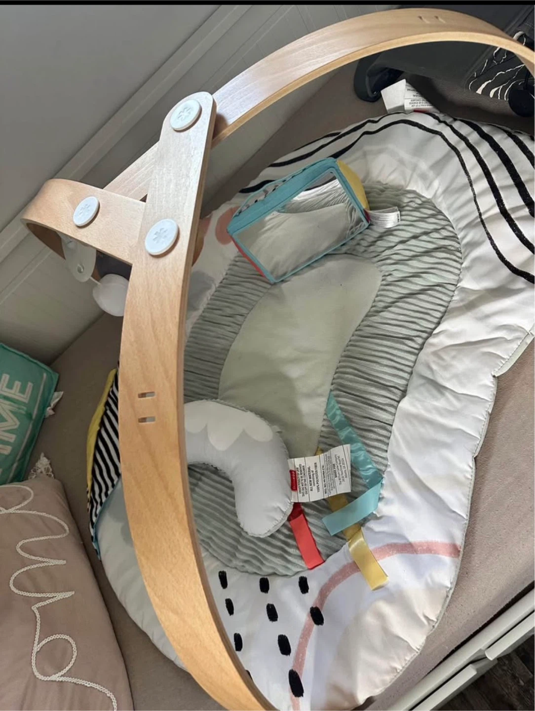 This Skip Hop activity gym features a wooden arch and various developmental toys. It includes a soft, quilted mat with a rainbow and abstract pattern. The gym comes with a mirror, a crinkle toy, and a mobile with soft balls.