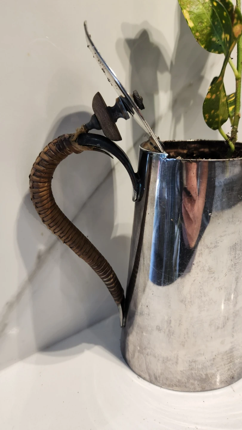 For the coffee lover who wants green vibes without the caffeine! This small silver coffee pot now holds a vibrant Croton Gold Dust—bright speckles that add instant personality.