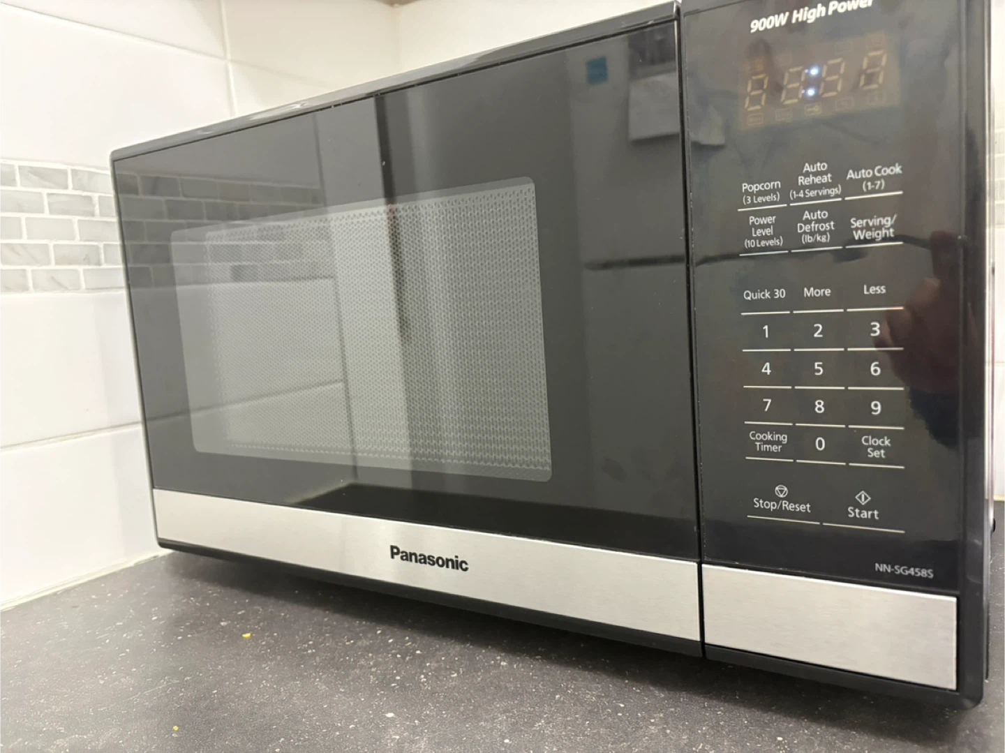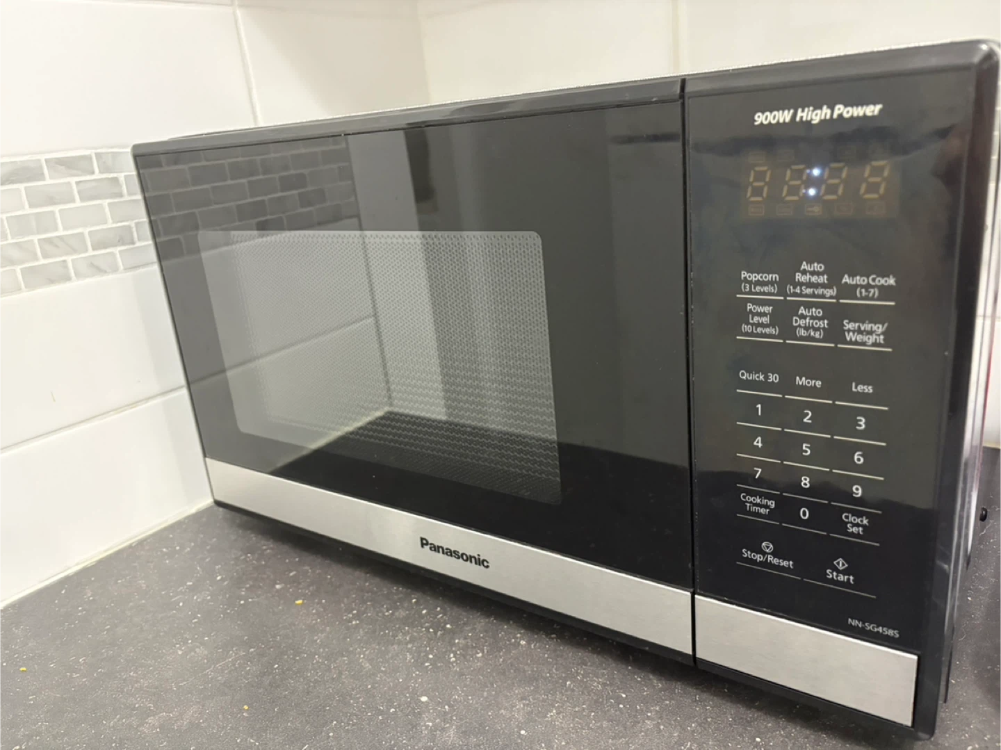 This is a Panasonic microwave oven. It has 900W high power for quick cooking. Features include auto cook and defrost settings.