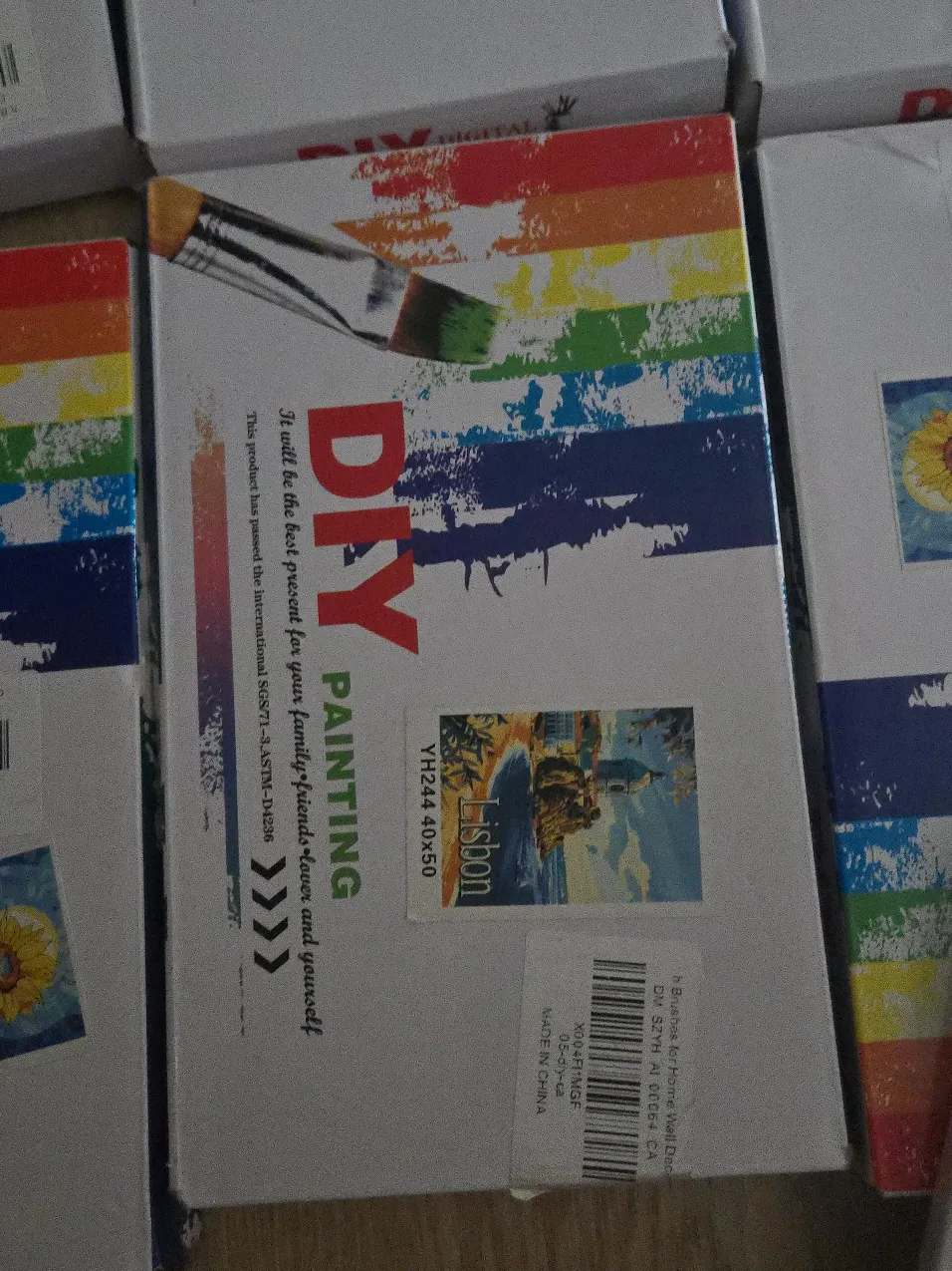 Get creative with this DIY painting kit! The box says it's perfect for family, friends, and yourself. It's a Lisbon-themed painting, sized at 40x50 cm. Unleash your inner artist!