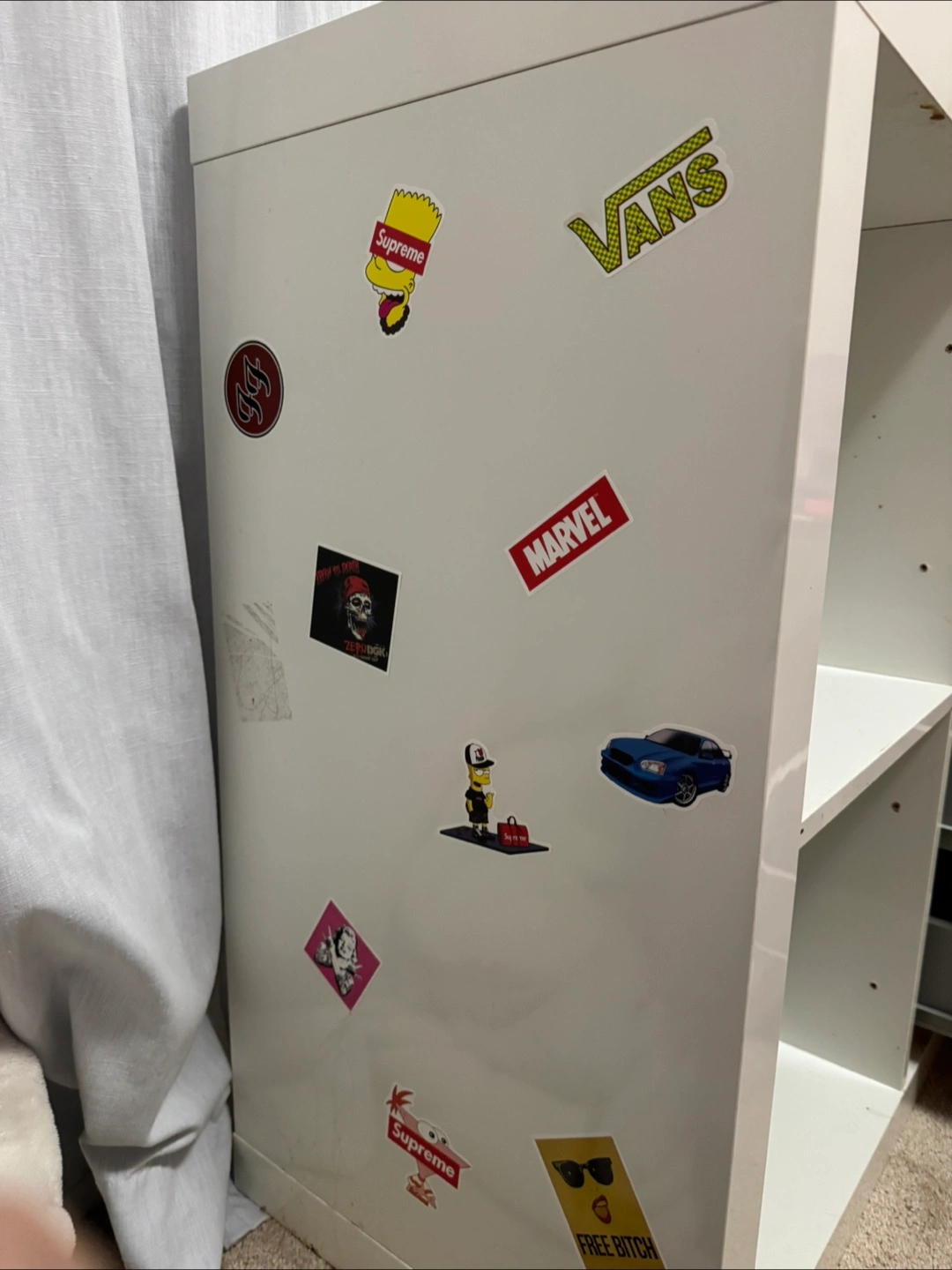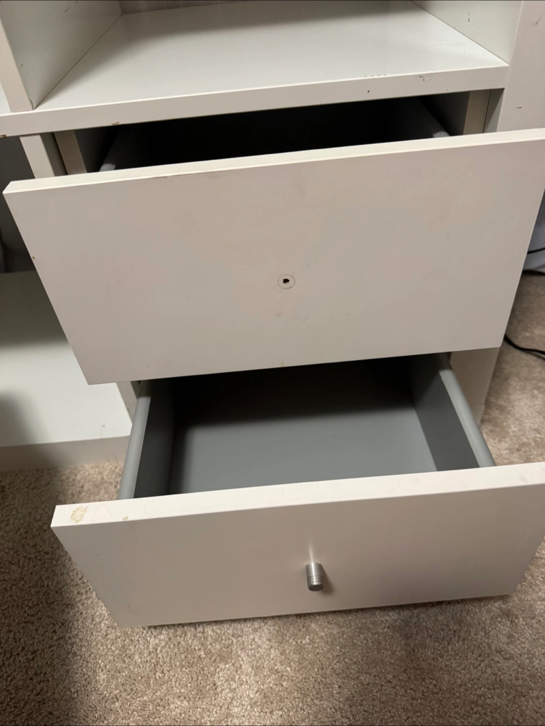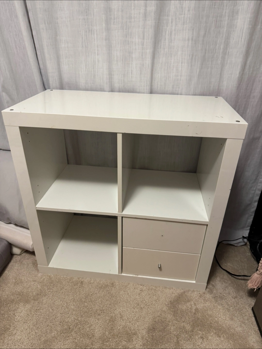 IKEA White Kallax cube shelving unit. I can include drawer (knob missing: need to pick up from ikea for free) . scratches and wear. Some stickers on one side. Sold as is