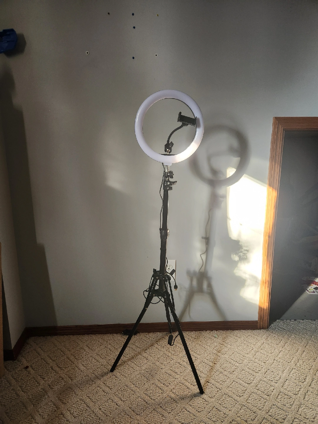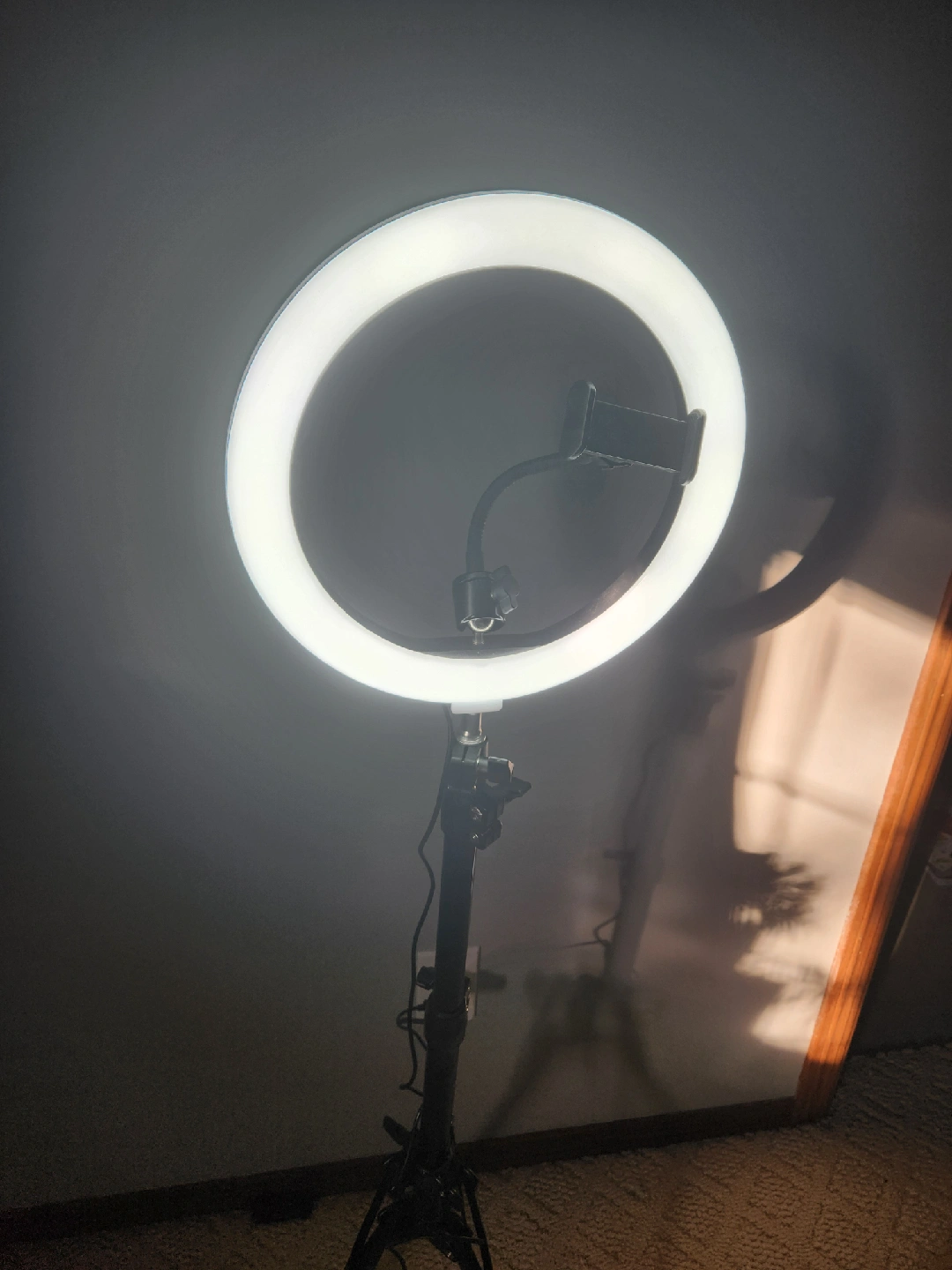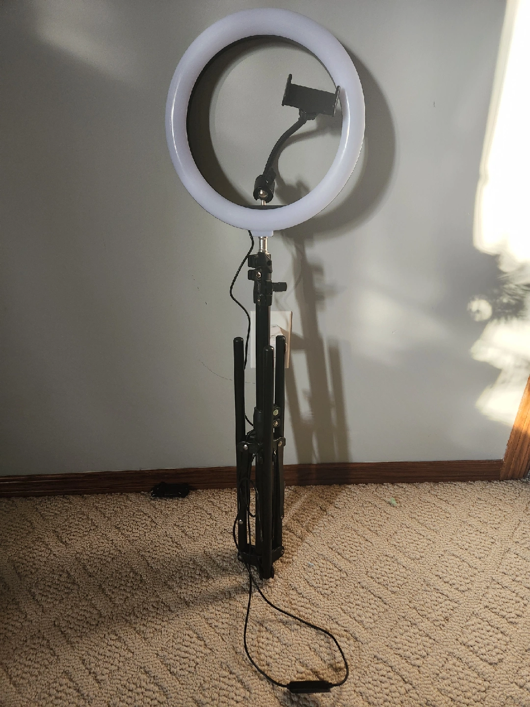Selling a ring light with a tripod stand! It's in great condition and perfect for taking photos or videos. It also comes with a remote that Bluetooth connects to your phone. the ring has 4 different light settings and a dimmer.