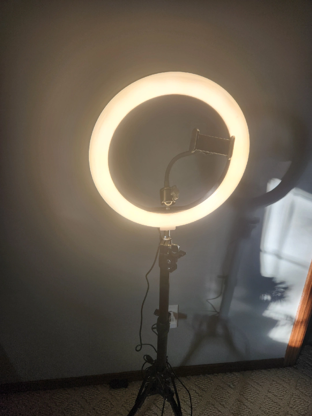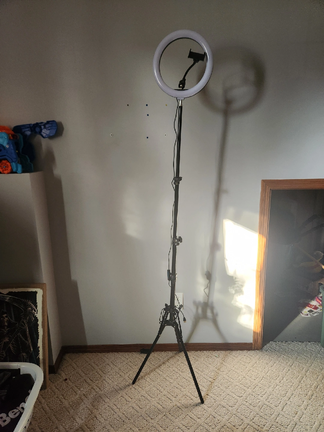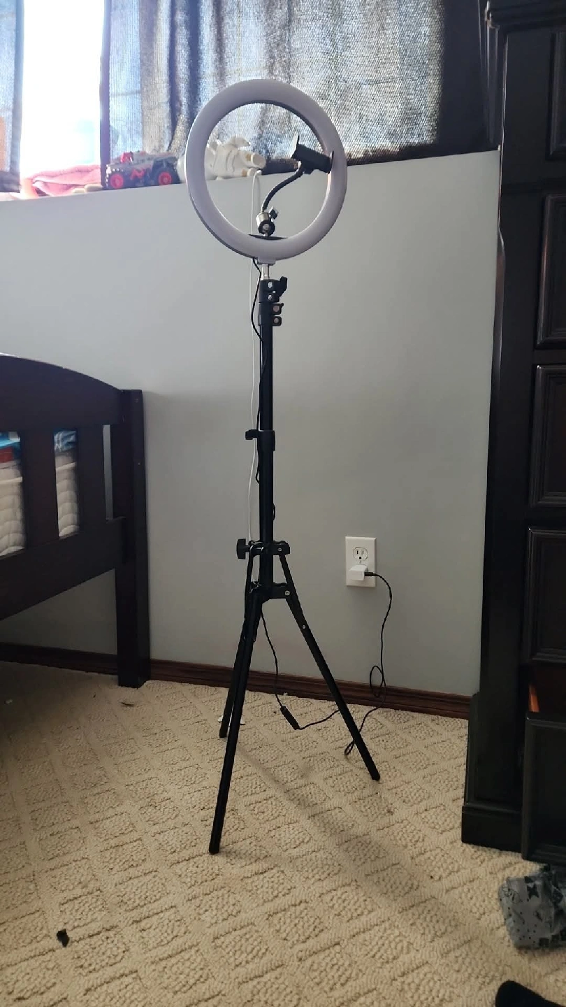 Selling a ring light with a tripod stand! It's in great condition and perfect for taking photos or videos. It also comes with a remote that Bluetooth connects to your phone. the ring has 4 different light settings and a dimmer.