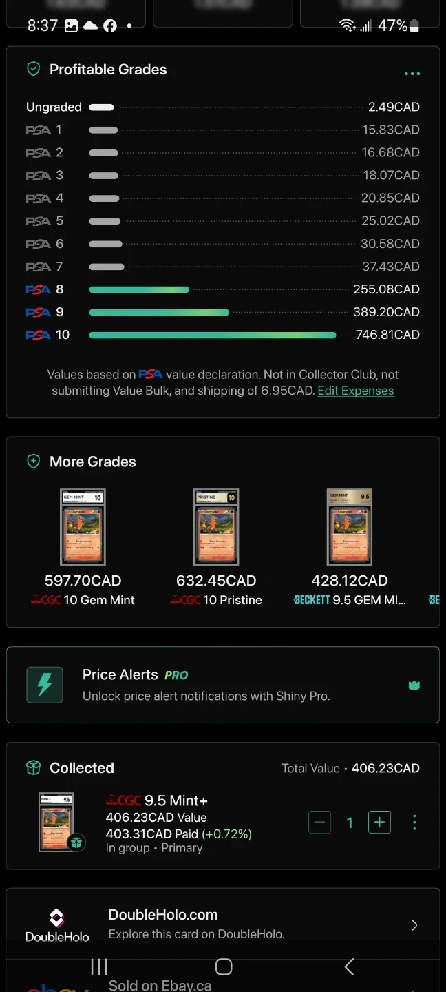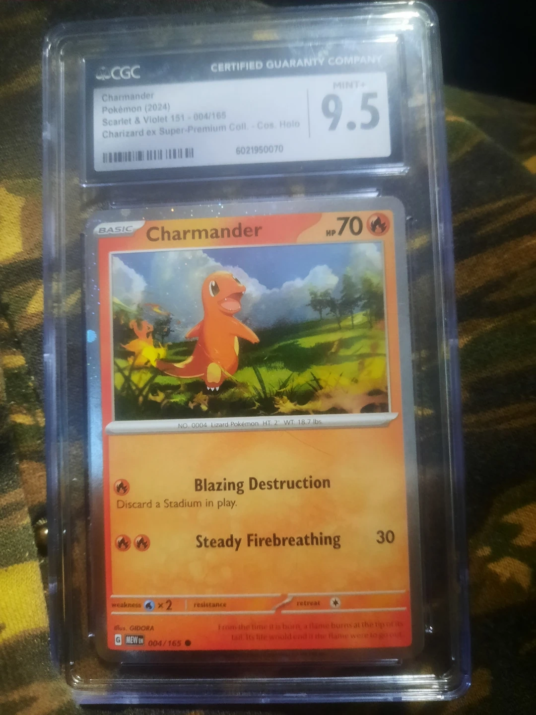 Buy & SellCGC Graded Pokémon Charmander Scarlet & Violet Card 9.5 Mint+CGC Graded Pokémon Charmander Scarlet & Violet Card 9.5 Mint+$400This is a CGC graded Charmander Pokémon card from the Scarlet & Violet set. It's a Cosmos Holo with a grade of 9.5 Mint+. The card number is 004/165.WHERE TO MEETCheck LocationView MapSELLERverifiedalexDelta831 review0 chats·0 favorites·6 viewsSEND CHAT TO SELLERHi alex! I’m interested in your listing.Hi alex! I’m interested in your listing.Get the Karrot app to chatSign In to chat
