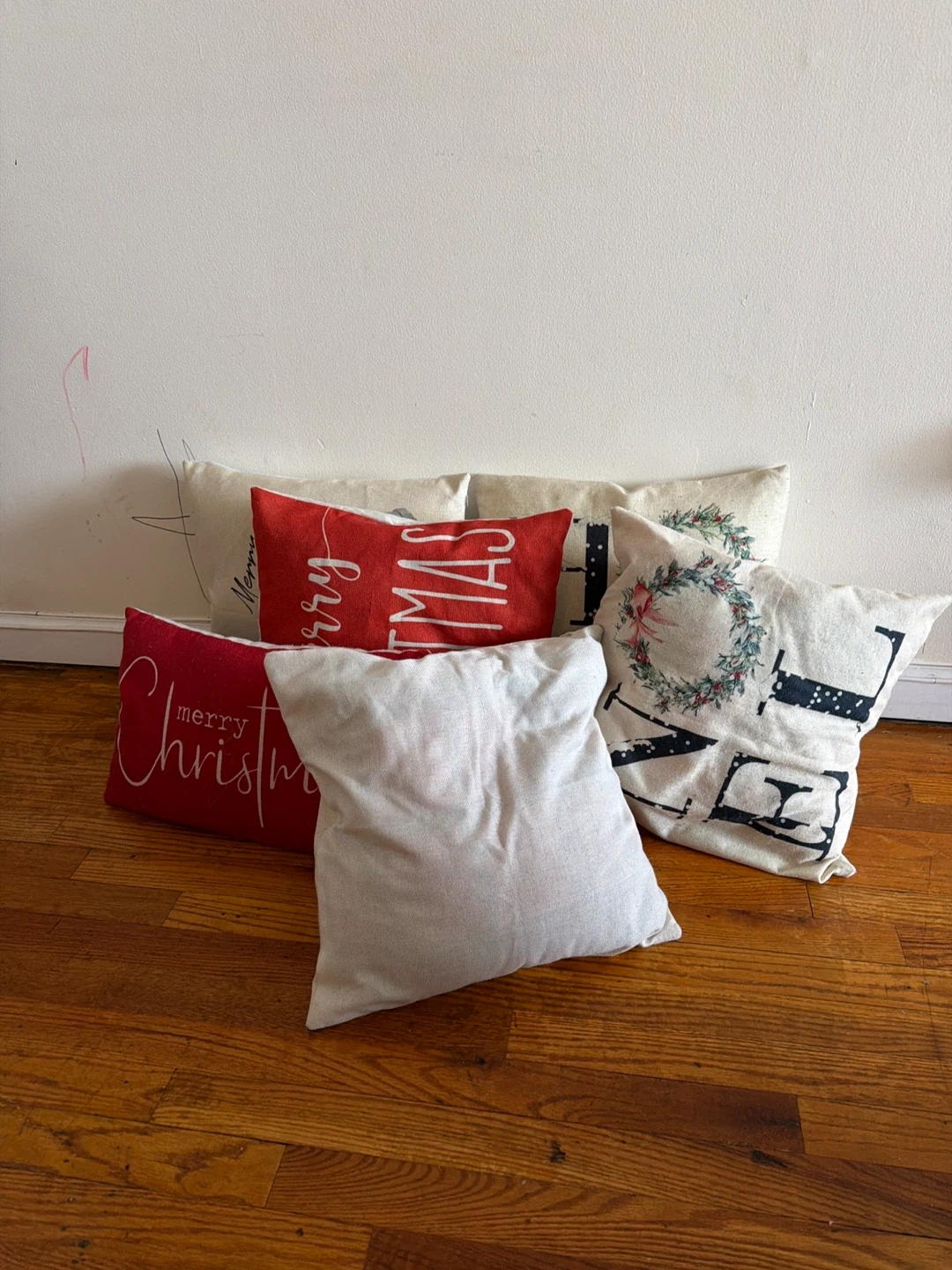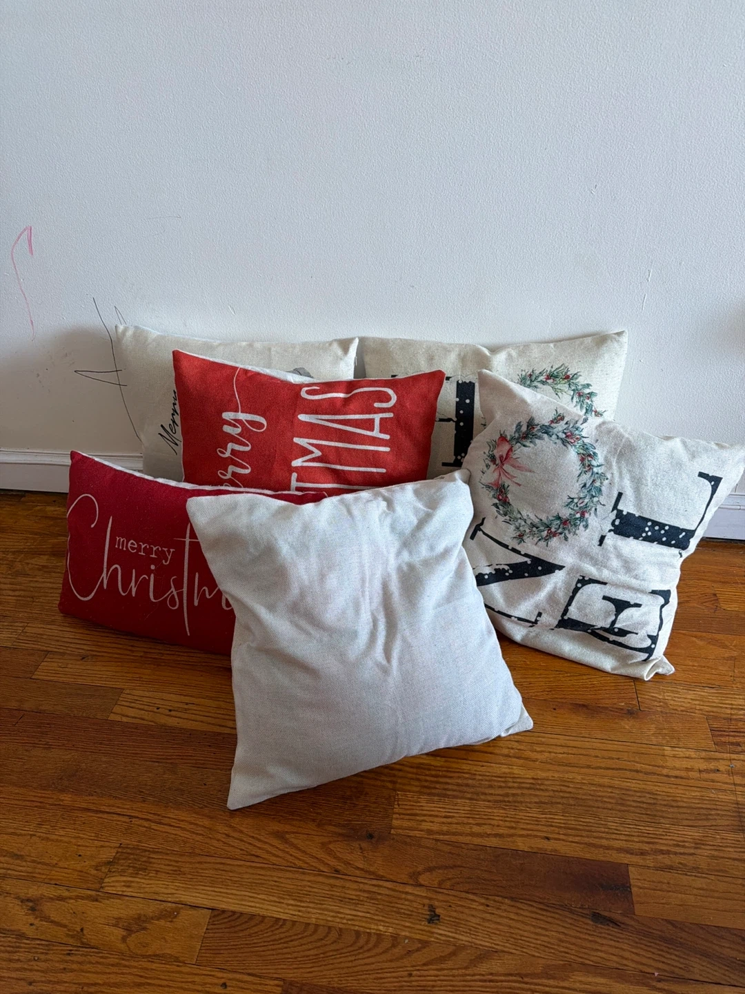 Includes six Christmas-themed throw pillows. Designs feature 'Merry Christmas' text and a wreath graphic. Pillow covers are made of fabric. These add a festive touch to your holiday decor!