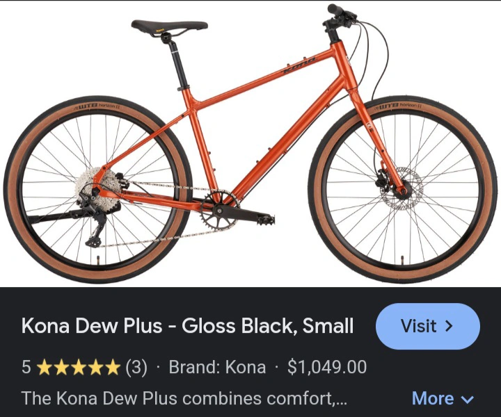 Buy & SellKona Dew Plus Gravel BikeKona Dew Plus Gravel Bike$300Used Kona Dew Plus gravel bike. Great condition. Ready to ride. Orange colour. Includes pedals. you must be able to pick up ConditionLike newWHERE TO MEETCheck LocationView MapSELLERverifiedRONNYRICHPembina Strip750 reviews3 chats·1 favorites·63 viewsSEND CHAT TO SELLERHi RONNYRICH! I’m interested in your listing.Hi RONNYRICH! I’m interested in your listing.Get the Karrot app to chatSign In to chat