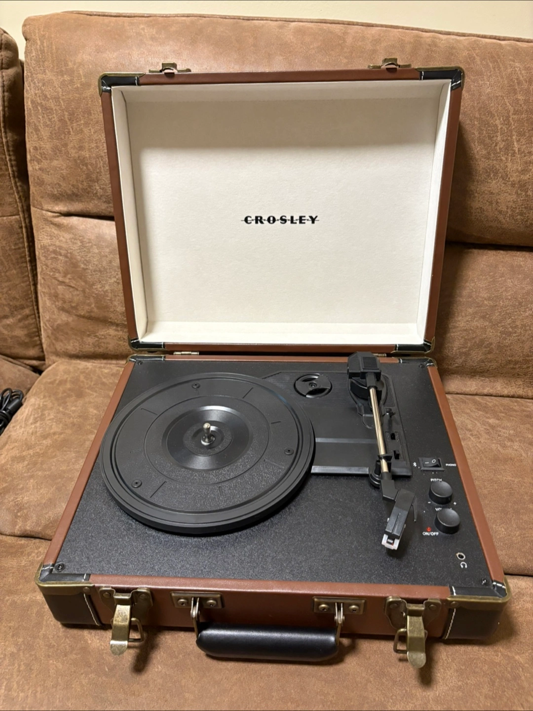 Selling a Crosley turntable! It comes with its original box and the necessary components for you to start spinning your favourite records. It's a great portable option for enjoying vinyl on the go!
