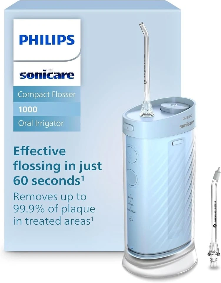 NEW in opened package (1 Nozzle Missing). Model# HX3333/24. This Philips Sonicare Compact Flosser removes up to 99.9% of plaque from between your teeth and along your gumline in just 60 seconds. It's lightweight, slim, portable, and easy to use with a collapsible 200 ml reservoir for a 1-minute clean. Features three flossing modes: Pulse, Clean, and Sensitive. Comes with two nozzles (N1 Standard and N2 Comfort) that rotate 360 degrees. Includes a 15-second pacer to guide you through quadrants. Feel free to message if you have any questions!