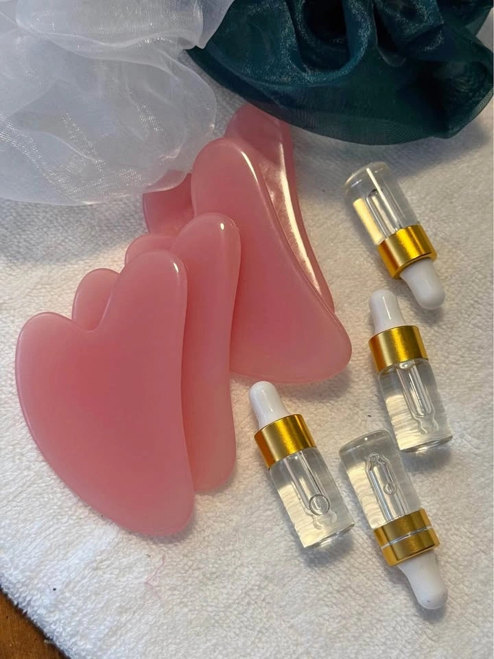 Glide the gua sha tool along cheeks, jawline, and forehead to release tension and encourage circulation.